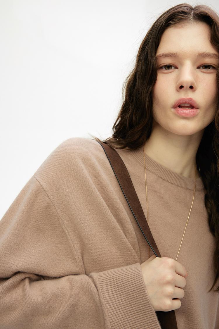 Oversized sweater in soft, fine-knit cashmere. Round neckline, dropped shoulders, and long sleeves. Ribbing at neckline, cuffs, and hem.