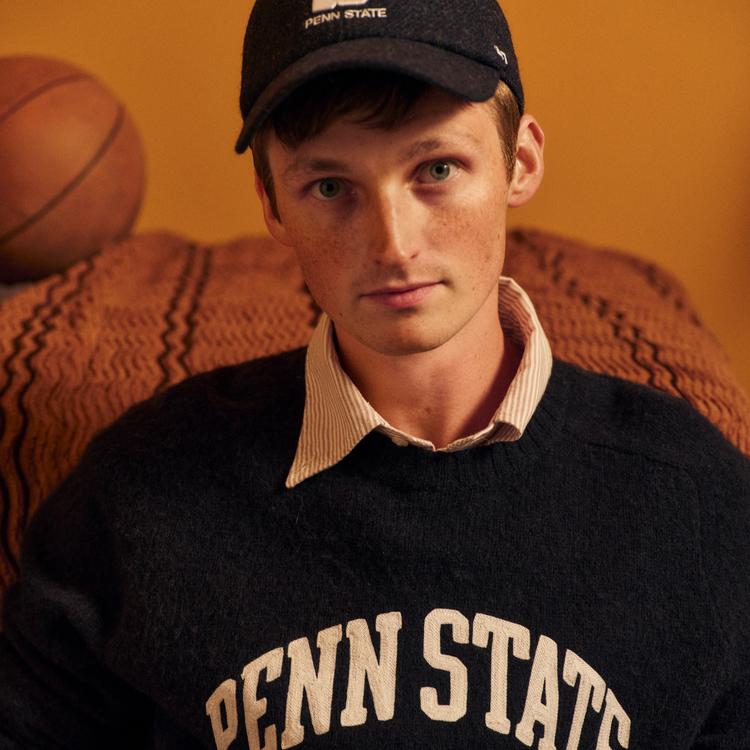 This classic J.Crew '47 X J.Crew brushed wool sweater features a regular fit with a crew neckline and long sleeves, offering cozy warmth in a hip-length silhouette. The matte dark blue wool fabric is brushed for a soft, textured feel, accented by a bold matte white 'PENN STATE' print across the front. Perfect for casual wear, loungewear, or workwear during autumn and winter seasons, this pullover sweater combines timeless collegiate style with comfortable everyday practicality.
