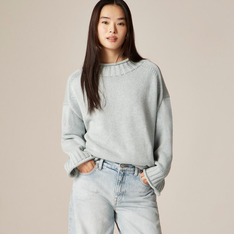 This relaxed-fit cotton sweater features a soft, textured knit with a ribbed rollneck collar and drop-shoulder long sleeves. Its light gray solid color and hip-length silhouette make it an easy layering piece for casual spring and autumn days. The pullover style enhances comfort and simplicity, perfect for casual outings, loungewear, or travel. With minimalist chic and cozy fabric, it pairs effortlessly with jeans for a laid-back yet polished look.