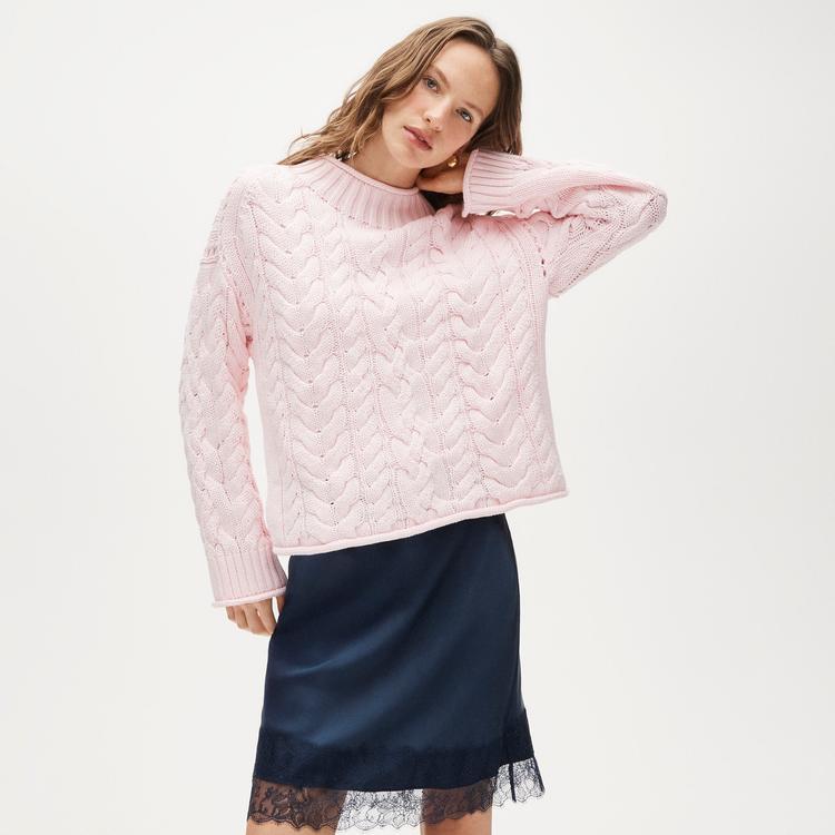 This cozy 2025 Rollneck™ sweater features a classic high neckline and long sleeves with a regular fit that hits at the waist. Crafted from soft cotton, the sweater showcases a delicate striped texture in light pink and white hues, adding subtle visual interest through its chunky knit design. Its pullover style and textured fabric make it ideal for casual wear, loungewear, or layering during autumn, winter, and spring. Pair it effortlessly with skirts or jeans for a timeless, comfortable look perfect for everyday and workwear occasions.