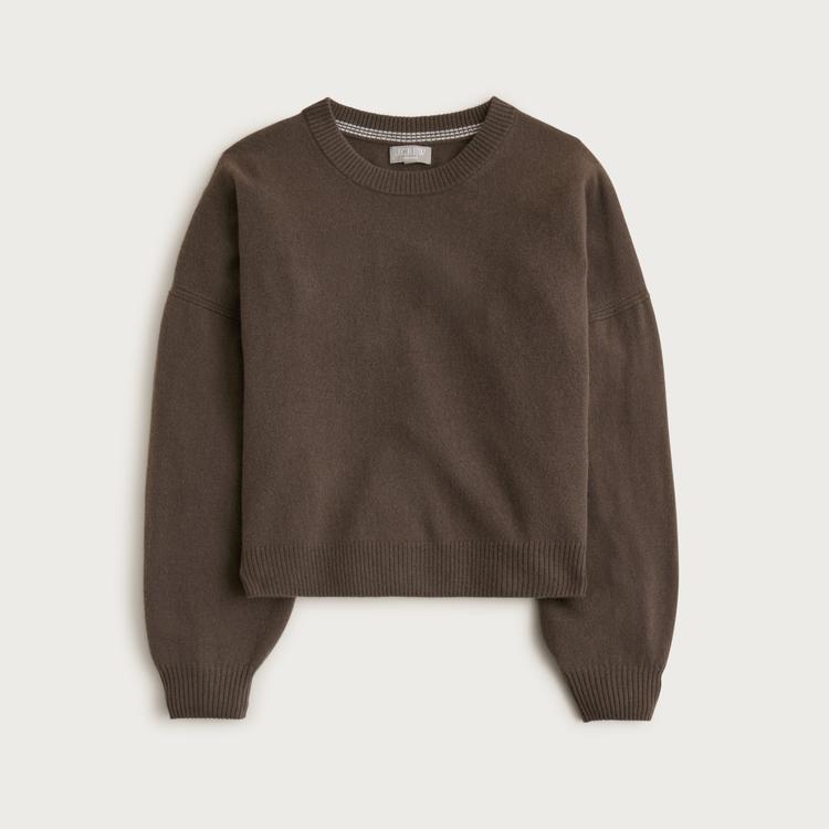 This brushed cashmere sweater features a relaxed fit with distinctive blouson sleeves and a classic crew neck. The waist-length silhouette in matte dark brown offers cozy warmth and soft texture ideal for cooler seasons. Its pullover style ensures easy wear, while the minimalist solid design makes it versatile for casual outings, business casual settings, or weekend brunches. Crafted from luxurious cashmere, this sweater blends comfort and understated elegance, perfect for layering or standalone wear during autumn, winter, and spring.