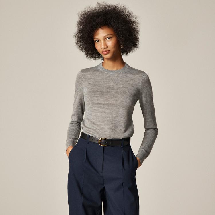 This Carolyn fitted crewneck sweater features a classic minimalist design in soft gray merino wool, offering warmth and comfort. The long regular sleeves and fitted silhouette create a sleek, polished look perfect for layering. Ideal for casual wear, business casual settings, or transitional seasons like autumn and spring, it pairs effortlessly with tailored trousers or skirts. The crew neck adds a timeless touch, making it a versatile wardrobe essential for cooler days.