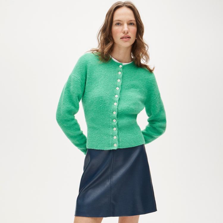 This bright green fitted cardigan crafted from a wool and nylon alpaca blend offers a soft, textured feel perfect for layering. Featuring a classic crew neck and long regular sleeves, it buttons down the front for a timeless silhouette that hits at the waist. Ideal for casual days, workwear, or brunch outings, its cozy yet refined design pairs effortlessly with skirts or trousers during autumn, winter, and spring seasons.