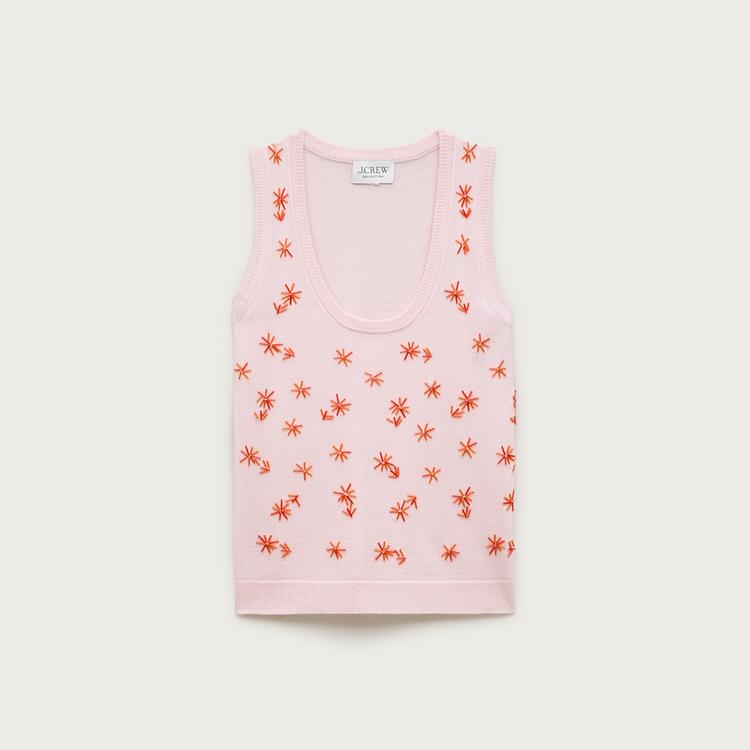 This sleeveless vest features a soft light pink merino wool fabric with bright orange floral appliqué embellishments all over. Designed with a round scoop neckline and a regular fit, the hip-length shell layers easily over shirts or tops. Its classic yet cute style makes it perfect for casual outings, business casual settings, or transitional autumn and spring layering. The wool fabric promises warmth while maintaining breathability for multiple seasons.