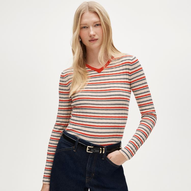 This slim-fit V-neck sweater features a wide-rib knit texture in soft wool, showcasing an all-over striped pattern in beige, red, brown, and black hues. The long sleeves and classic V-neckline create a timeless silhouette perfect for layering. Its striped design and comfortable wool fabric make it an ideal choice for casual wear, workwear, or business casual settings during autumn through spring seasons.