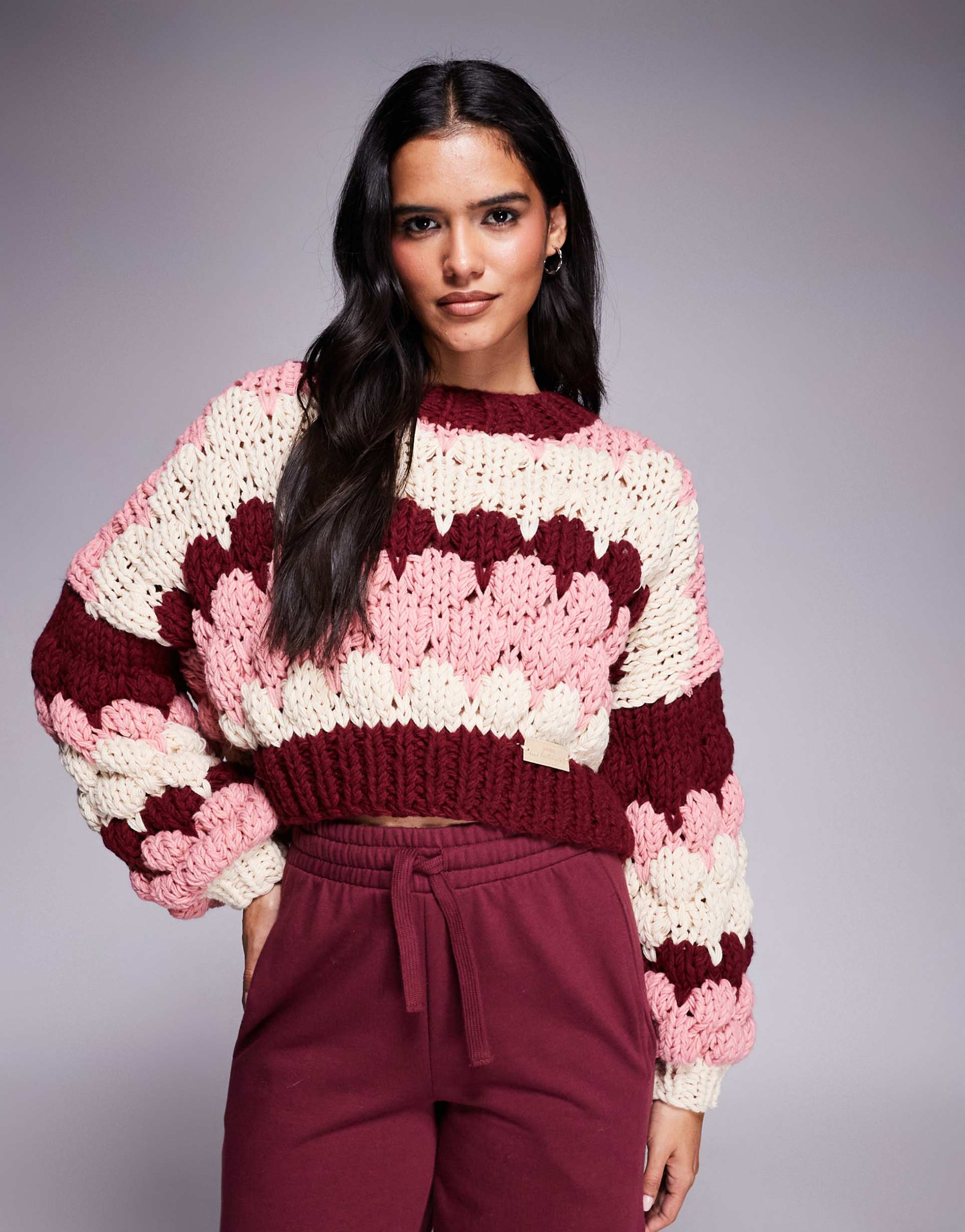 KIWI & CO SWEETHEART CHUNKY HAND KNIT BALLOON SLEEVE CROPPED SWEATER IN BURGUNDY BUBBLE STRIPES