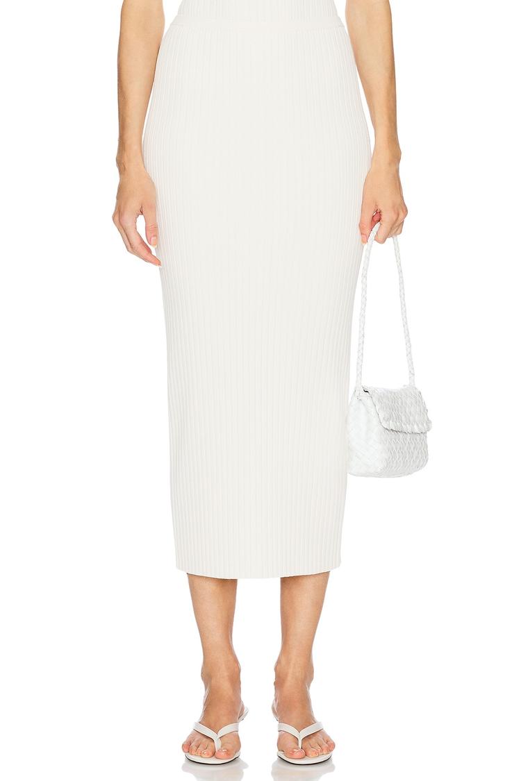A sleek midi-length skirt crafted from a midweight ribbed knit blend of cotton and wool offers a slim, figure-hugging fit. The clean hemline and pure white shade create a minimalist and versatile piece ideal for casual brunches, relaxed date nights, or stylish everyday wear. Its pull-on style ensures easy comfort and effortless sophistication during autumn and winter seasons.
