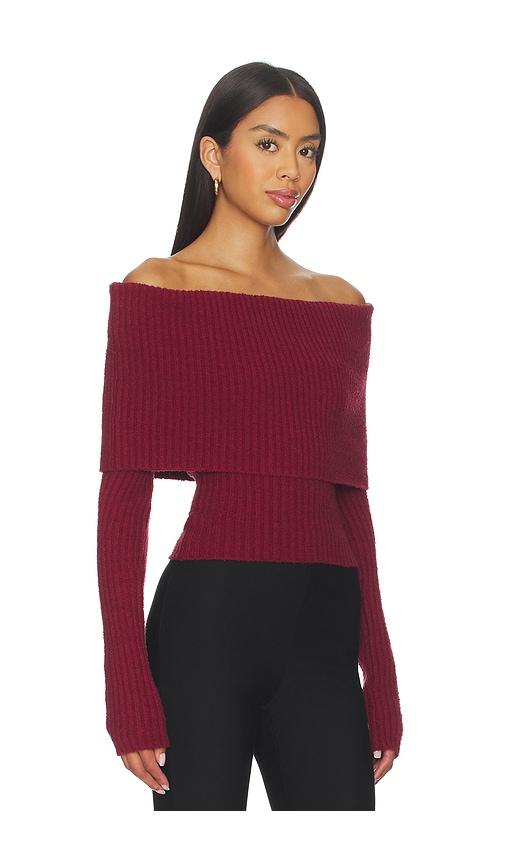 L'ACADEMIE BY MARIANNA NAMIR OFF SHOULDER SWEATER IN BURGUNDY.