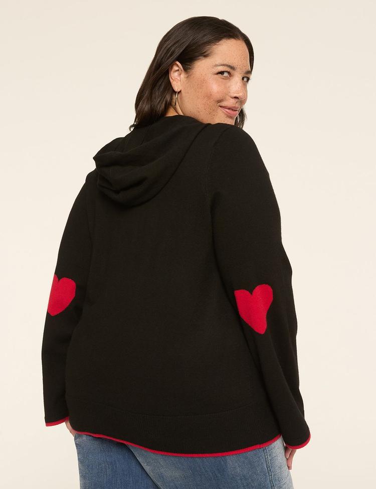 Available in Plus Size Season-of-love-style done just right is this hoodie sweater with sweet heart-shaped elbow patches and an embroidered ""love"" message. FIT: Classic. Designed for curves and a not-too-tight, not-too-loose, just-right fit. Front Length: 30"" Standard length FEATURES: Classic hood Long sleeves Ribbed trim Elbow patches Contrast detail at hem and sleeves SPECIAL DETAIL: Embroidered graphic FABRIC: Soft, stretchy sweater knit MACHINE WASH COLD WITH LIKE COLORS, ONLY NON-CHLORINE BLEACH WHEN NEEDED, RESHAPE AND LAY FLAT TO DRY, COOL IRON IF NEEDED. 100% ACRYLIC Item Number #413734 Imported Plus Size Top ". Plus Size Embroidered Love Elbow-Patch Hoodie Sweater, in Black Sparkle Love, 14/16, Women's, Lane Bryant