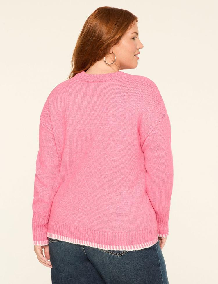 Available in Plus Size A timeless sweater, crafted in plush-to-the-touch sweater knit, with contrast detailing along the hem. FIT: Classic. Designed for curves and a not-too-tight, not-too-loose, just-right fit. Front Length (On Body): 29" Standard length FEATURES: Crew neck Long sleeves Ribbed trim Contrast detail at hem FABRIC: Cozy-soft sweater knit with the perfect amount of stretch MACHINE WASH COLD WITH LIKE COLORS, ONLY NON-CHLORINE BLEACH WHEN NEEDED, RESHAPE AND LAY FLAT TO DRY, COOL IRON IF NEEDED 100% POLYESTER Item Number #413533 Imported Plus Size Top ". Plus Size Long-Sleeve Crew-Neck Sweater, in Rose Pink, 18/20, Women's, Lane Bryant