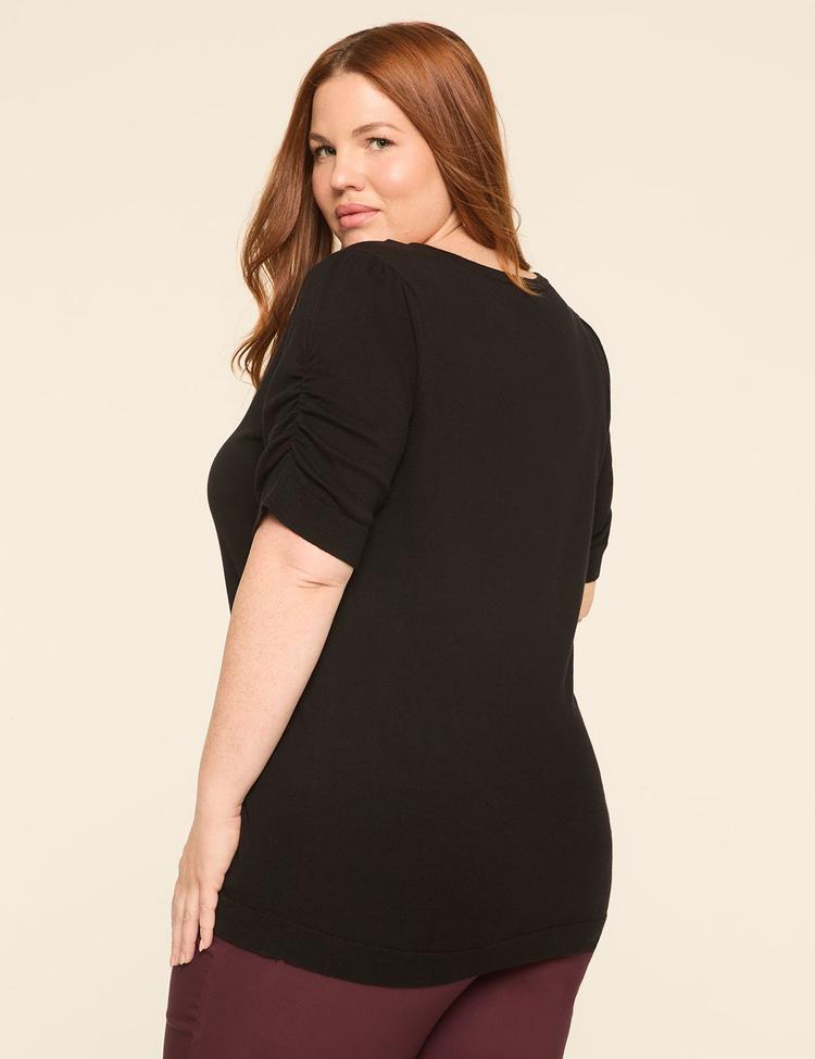 Available in Plus Size Everyday luxury is this pullover sweater with ruched puff sleeves, soft ribbed trim and cozy-to-the-touch knit. FIT: Classic. Designed for curves and a not-too-tight, not-too-loose, just-right fit. Length: 29.5" Standard length FEATURES: Notch neck Short puff sleeves with ruching Ribbed trim FABRIC: Soft, breathable and stretchy sweater knit Machine Wash 80% Cotton/20% Nylon Item Number #412369 Imported Plus Size Top ". Plus Size Puff-Sleeve V-Neck Sweater, in Black, 26/28, Women's, Lane Bryant
