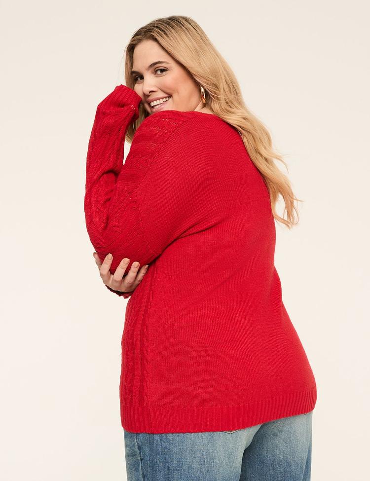 Available in Plus Size A perfectly timeless V-neck sweater so cozy and so classic, you'll want one in every color. FIT: Classic. Designed for curves and a not-too-tight, not-too-loose, just-right fit. Front Length (On Body): 32" Longer length is perfect for added coverage FEATURES: V-neck Long drop shoulder sleeves Ribbed trim FABRIC: Cozy-soft cable sweater knit with the perfect amount of stretch Machine Wash Cold With Like Colors Only Non-Chlorine Bleach When Needed Reshape And Lay Flat To Dry Cool Iron If Needed 100% Polyester Item Number #413211 Imported Plus Size Top ". Plus Size V-Neck Cable Knit Pullover Sweater, in Red, 10/12, Women's, Lane Bryant