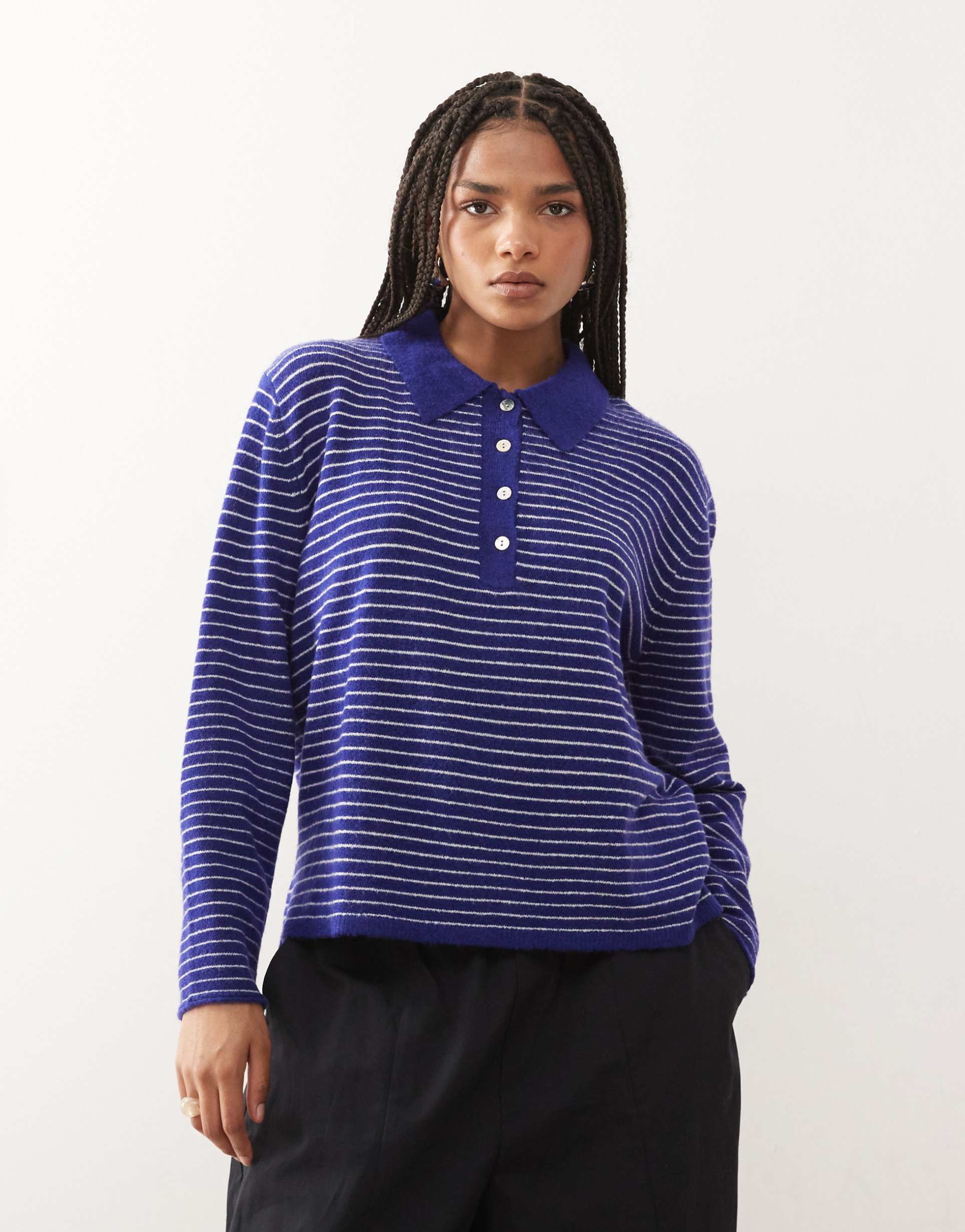Blue striped knit fabric and a boxy fit define this long sleeve polo sweater by Lioness. Featuring a classic polo collar and a partial button placket, this hip-length top offers a cozy mid-weight feel with its acrylic blend. Its timeless striped pattern and relaxed silhouette make it ideal for casual days, workwear, and business casual settings, especially in cooler autumn and winter months. The covered back and regular sleeves complete the minimalist yet chic aesthetic, ensuring versatile style and comfort.