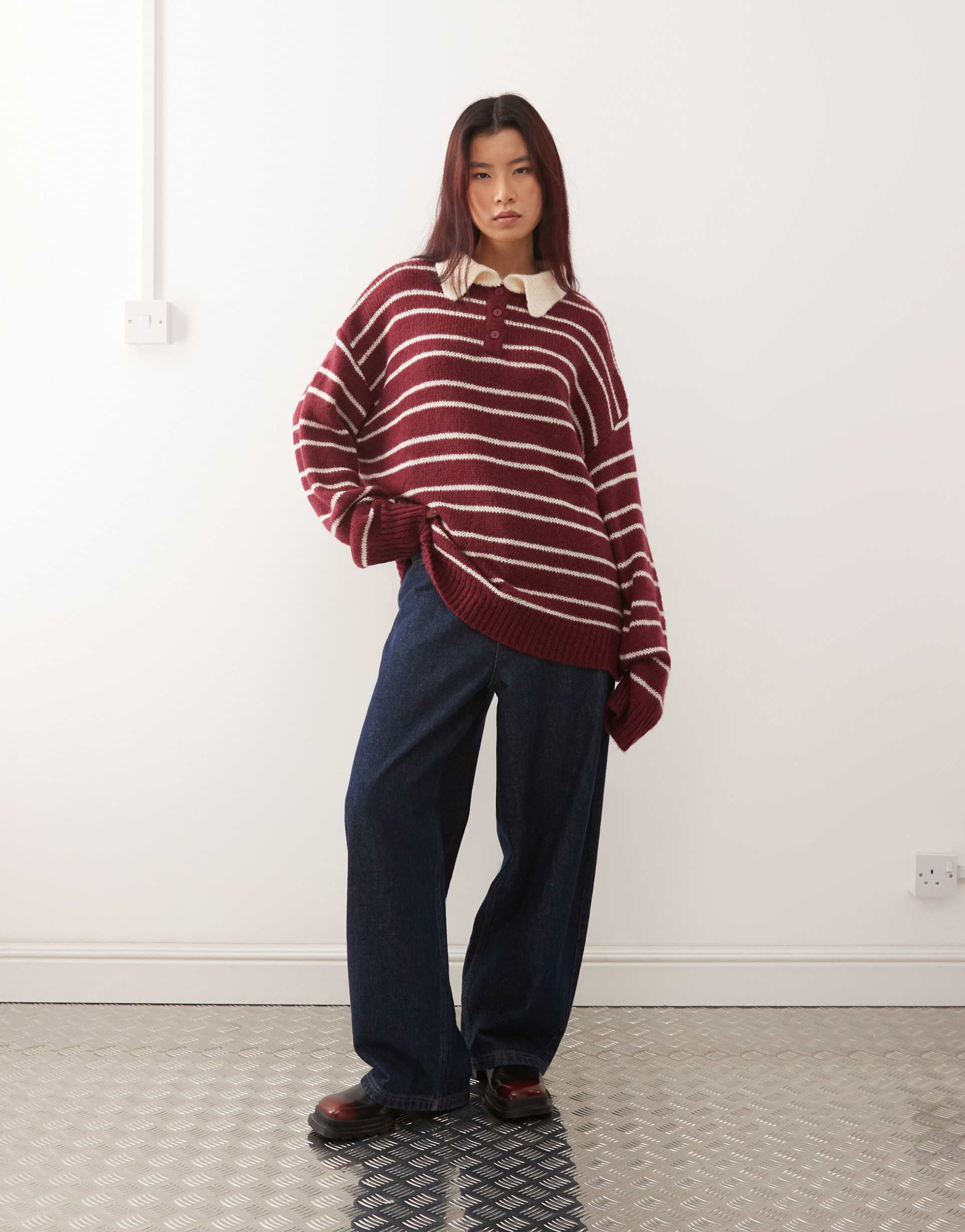 LIONESS RISING SUN KNIT CONTRAST COLLAR OVERSIZED SWEATER IN BURGUNDY AND CREAM STRIPES