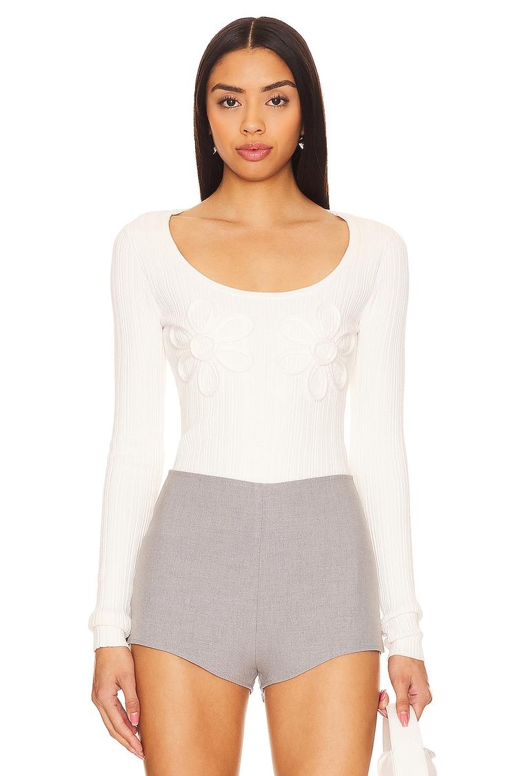 Soft ribbed jersey fabric and a fitted silhouette combine in this Quinella Sweater for a cozy yet chic look. The scoop neckline and long sleeves offer classic styling, while tonal floral embroidery at the bust adds a subtle decorative touch. Crafted in a versatile ivory hue, this waist-length shell top transitions effortlessly from casual brunches to workwear settings and relaxed weekend outings. Its midweight knit ensures comfort across spring, autumn, and winter seasons, making it a refined staple for layering or wearing solo.