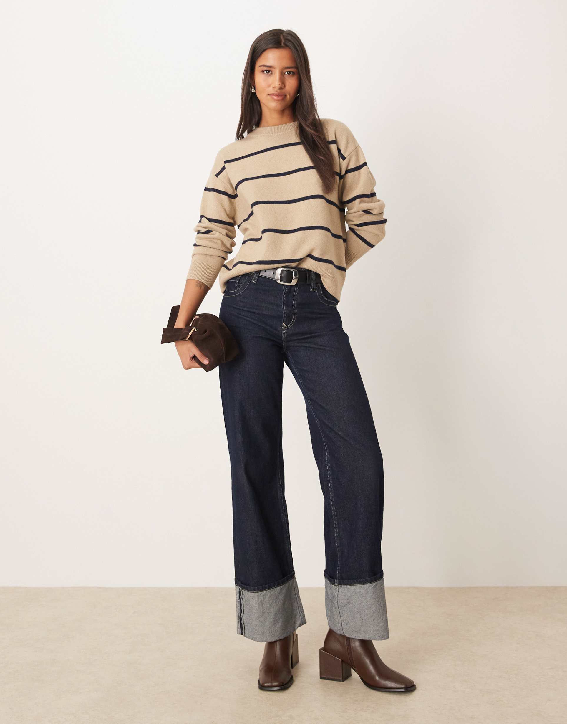 MANGO CREW NECK SWEATER IN LIGHT BROWN AND BLACK STRIPE