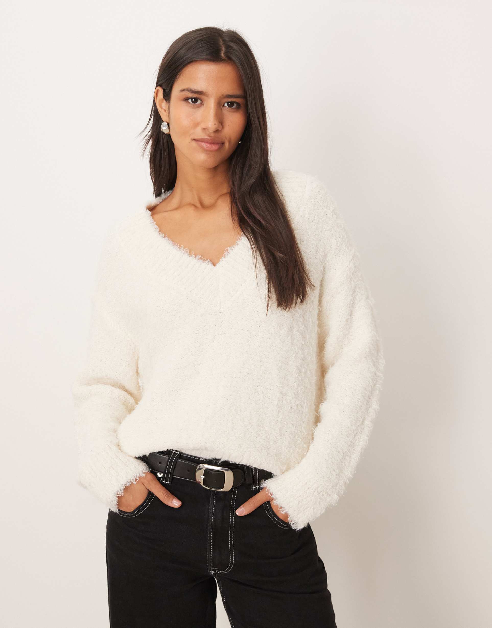 MANGO V NECK FLUFFY SWEATER IN WHITE