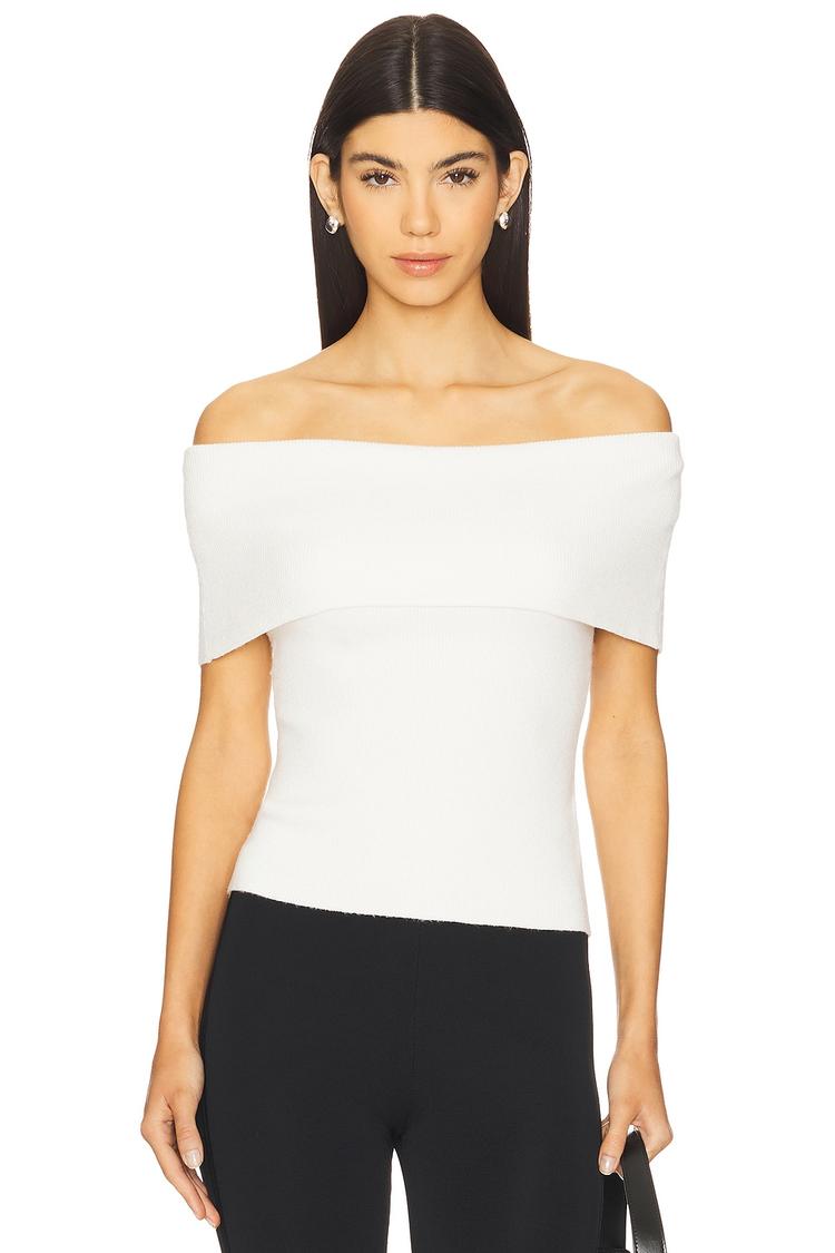 Softly structured with a midweight ribbed knit, this fitted shell top features a striking off-shoulder foldover neckline that elegantly frames the décolletage. Crafted from a blend of viscose, polyester, and nylon, it offers comfortable stretch and a sleek silhouette. Its sleeveless design and waist-length cut make it perfect for layering or wearing alone. Ideal for casual days, workwear settings, or business casual events, this minimalist white top combines classic elegance with modern simplicity for versatile seasonal styling.