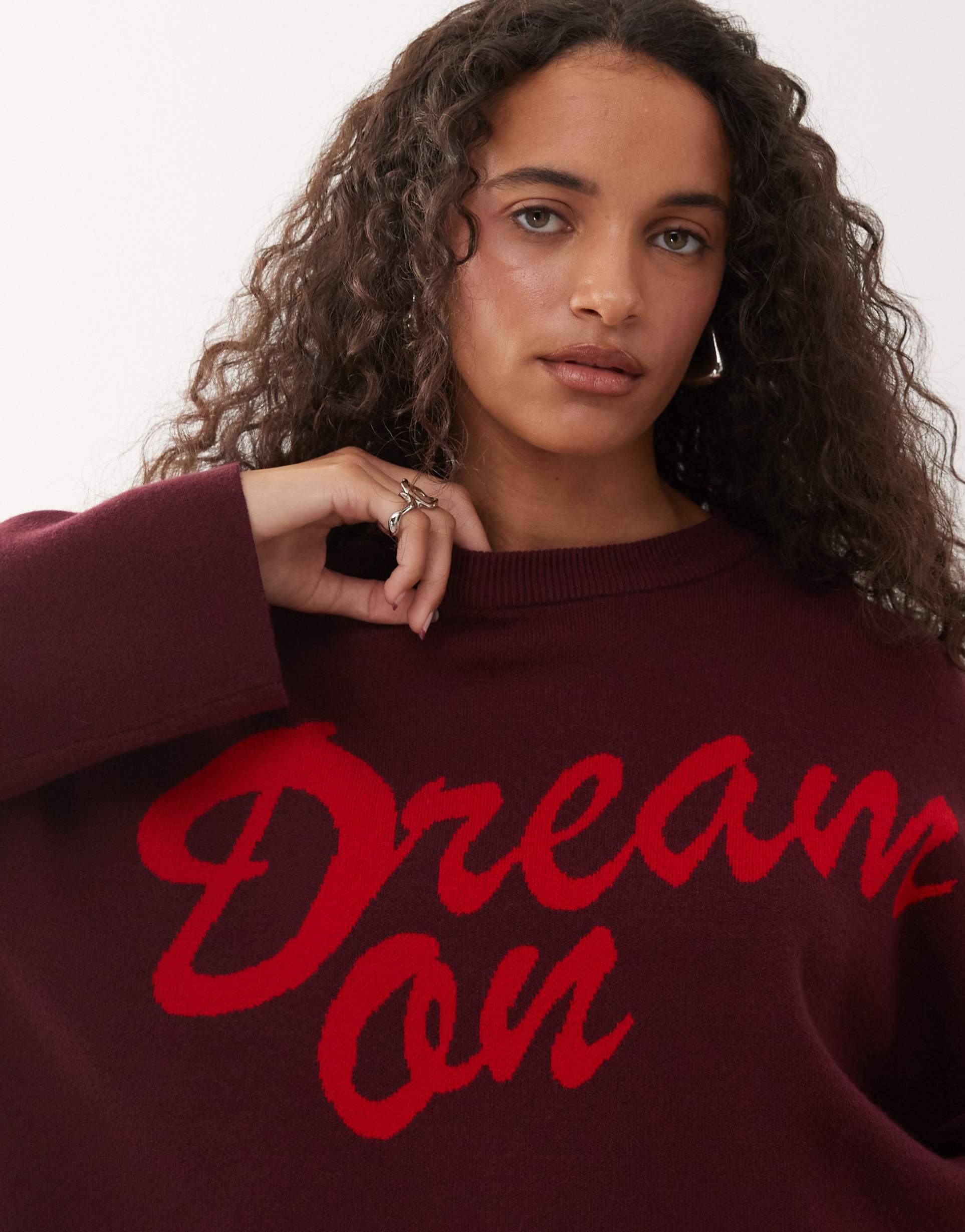 NOISY MAY CREW NECK BOXY KNIT SWEATER IN BURGUNDY WITH RED TEXT