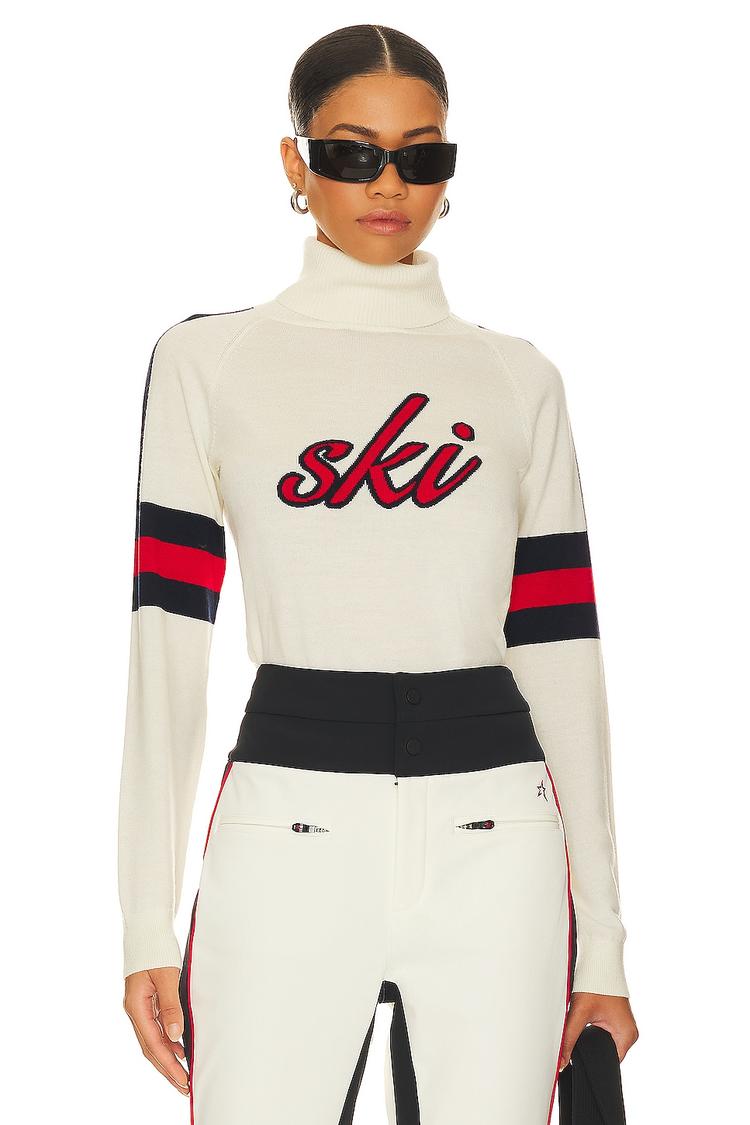 This fitted, waist-length sweater crafted from 100% merino wool offers both warmth and lightweight comfort. Featuring a classic turtle neck and ribbed trim, it showcases a sporty front 'ski' logo in red, complemented by navy and red stripes on the long sleeves. Its solid off-white base contrasted with bold color blocking on the sleeves brings a casual chic and sporty vibe, perfect for athleisure wear, casual outings, and travel during cooler seasons. The pullover design emphasizes ease and style with a sleek silhouette.