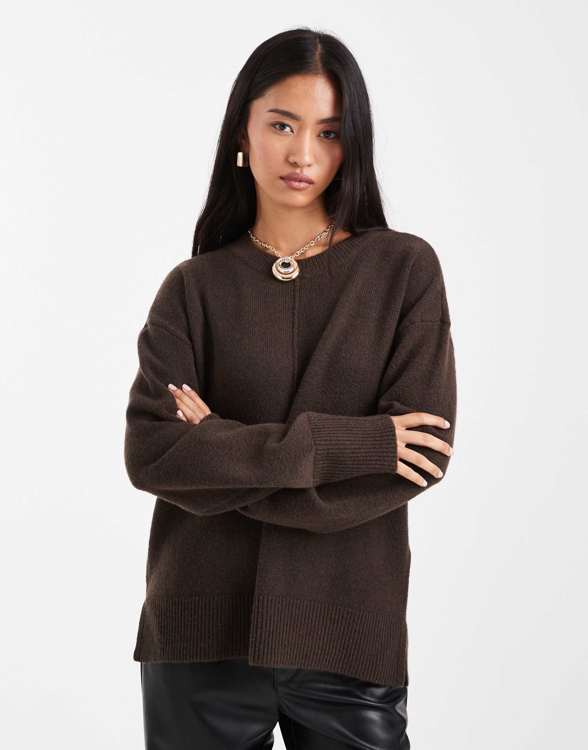 PIECES SEAM DETAIL KNIT SWEATER IN HEATHERED CHOCOLATE BROWN