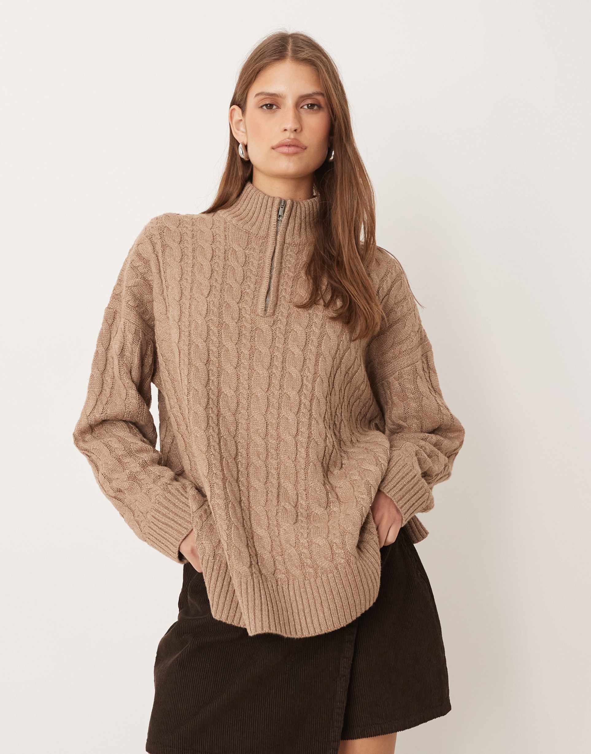 This relaxed fit sweater features a high neck with a half zip closure, crafted in a chunky polyester cable knit that provides textured warmth and style. The drop-shoulder long sleeves and ribbed trim at cuffs and hem add subtle detailing, while the hip-length silhouette offers casual comfort. Perfect for casual outings, loungewear days, or travel during the cooler autumn and winter months, this neutral taupe knit is an effortless layering piece that blends cozy and chic aesthetics.