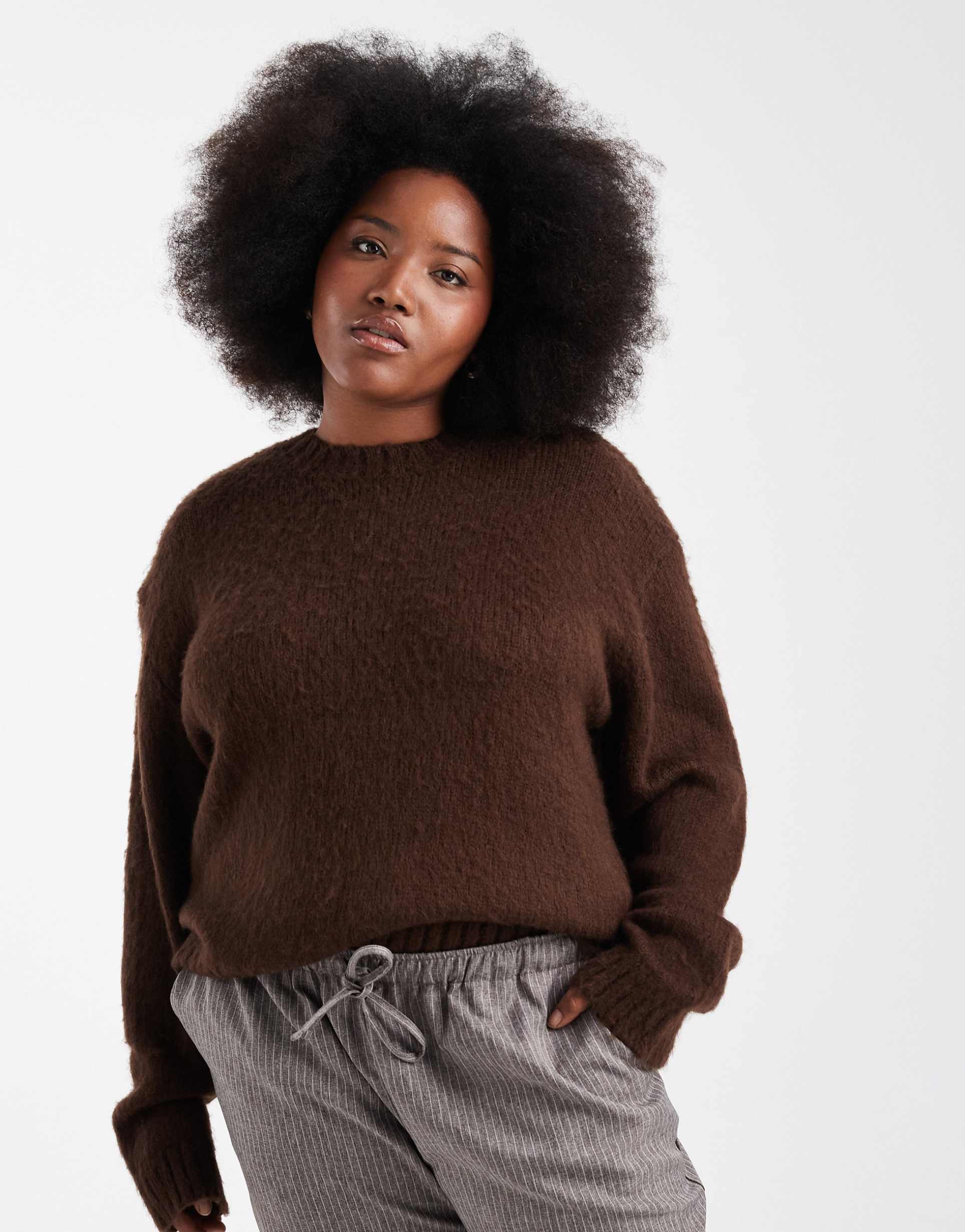 RENEE STUDIO PLUS EXCLUSIVE FLUFFY KNIT OVERSIZED DROP SHOULDER CREW NECK SWEATER IN CHOCOLATE