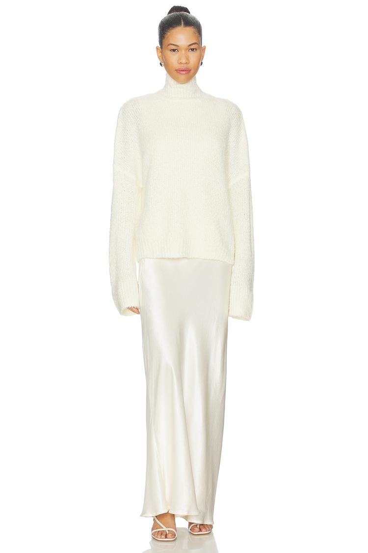 Softly textured in a fine knit blend of acrylic and wool, this cream-colored sweater features a relaxed fit and a high neck for cozy warmth. Its long sleeves and waist-length cut make it a versatile layering piece. The detachable knit sweater pairs elegantly with a smooth satin skirt in matching cream tones, fully lined for comfort. Ideal for casual outings, loungewear, or travel, this minimalist ensemble blends effortless style with functional ease through its pull-on design and detachable feature.