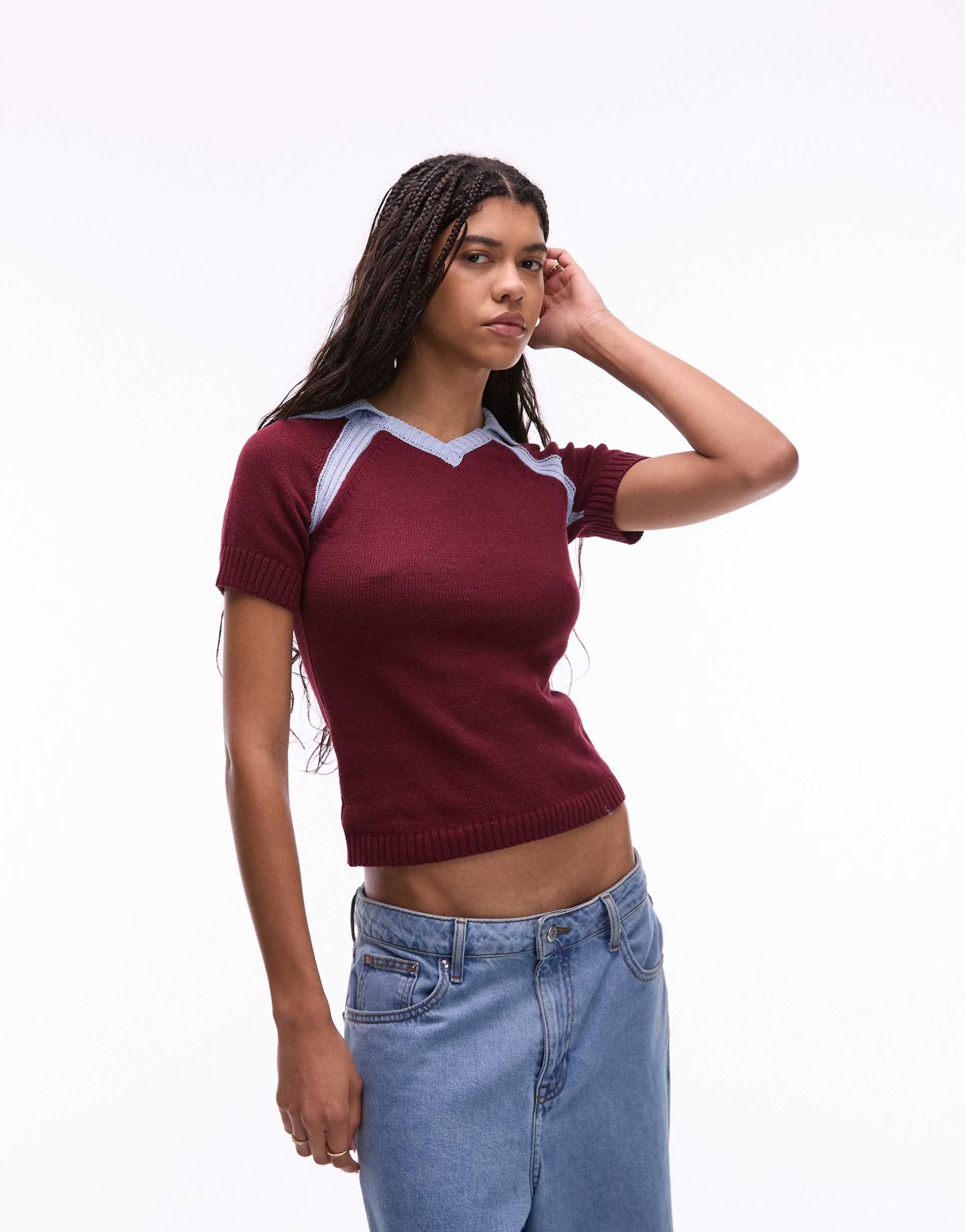 TOPSHOP KNIT SOCCER POLO IN BURGUNDY AND BLUE