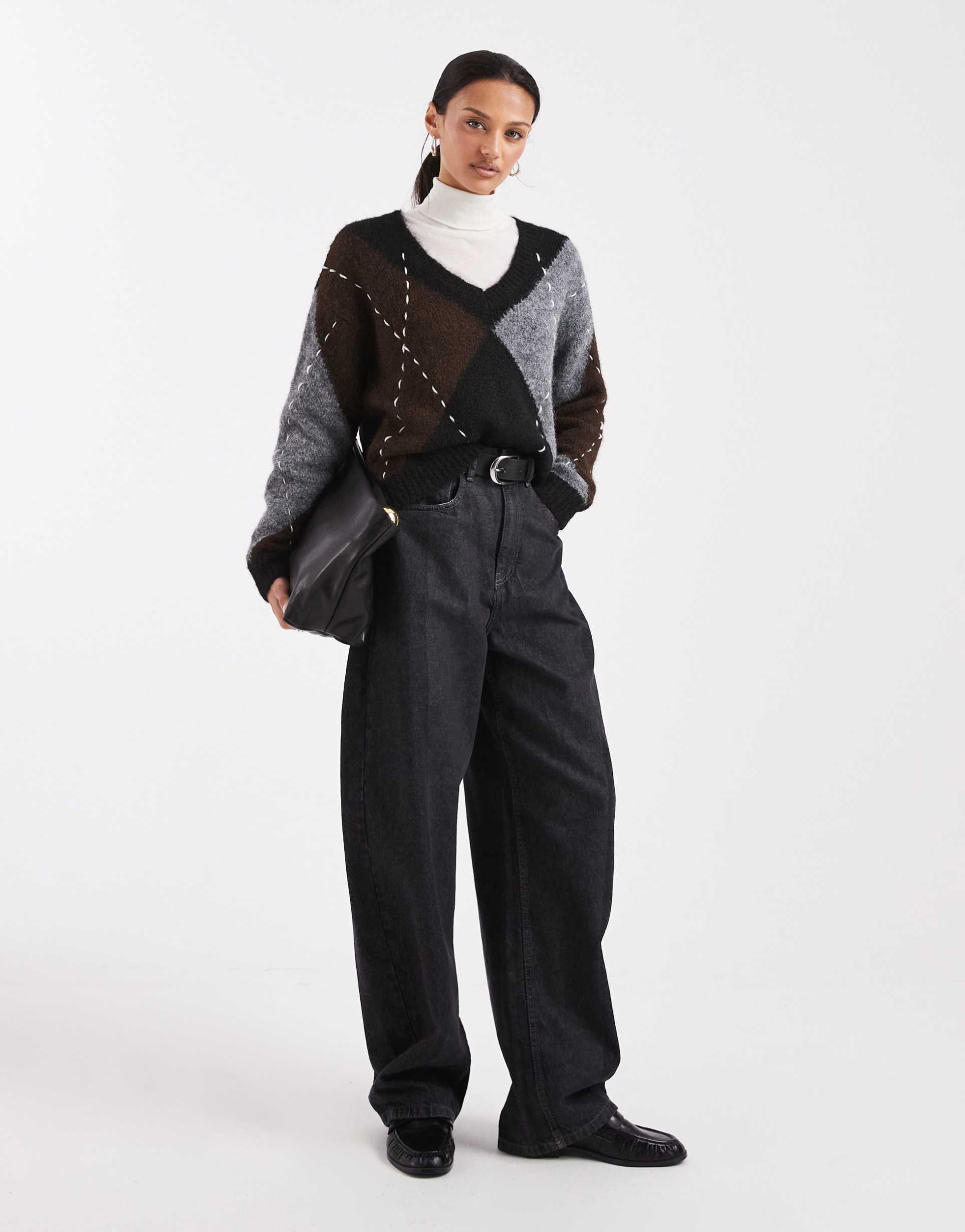 VERO MODA ARGYLE STITCH DETAILING KNIT SWEATER IN BLACK AND CHOCOLATE BROWN