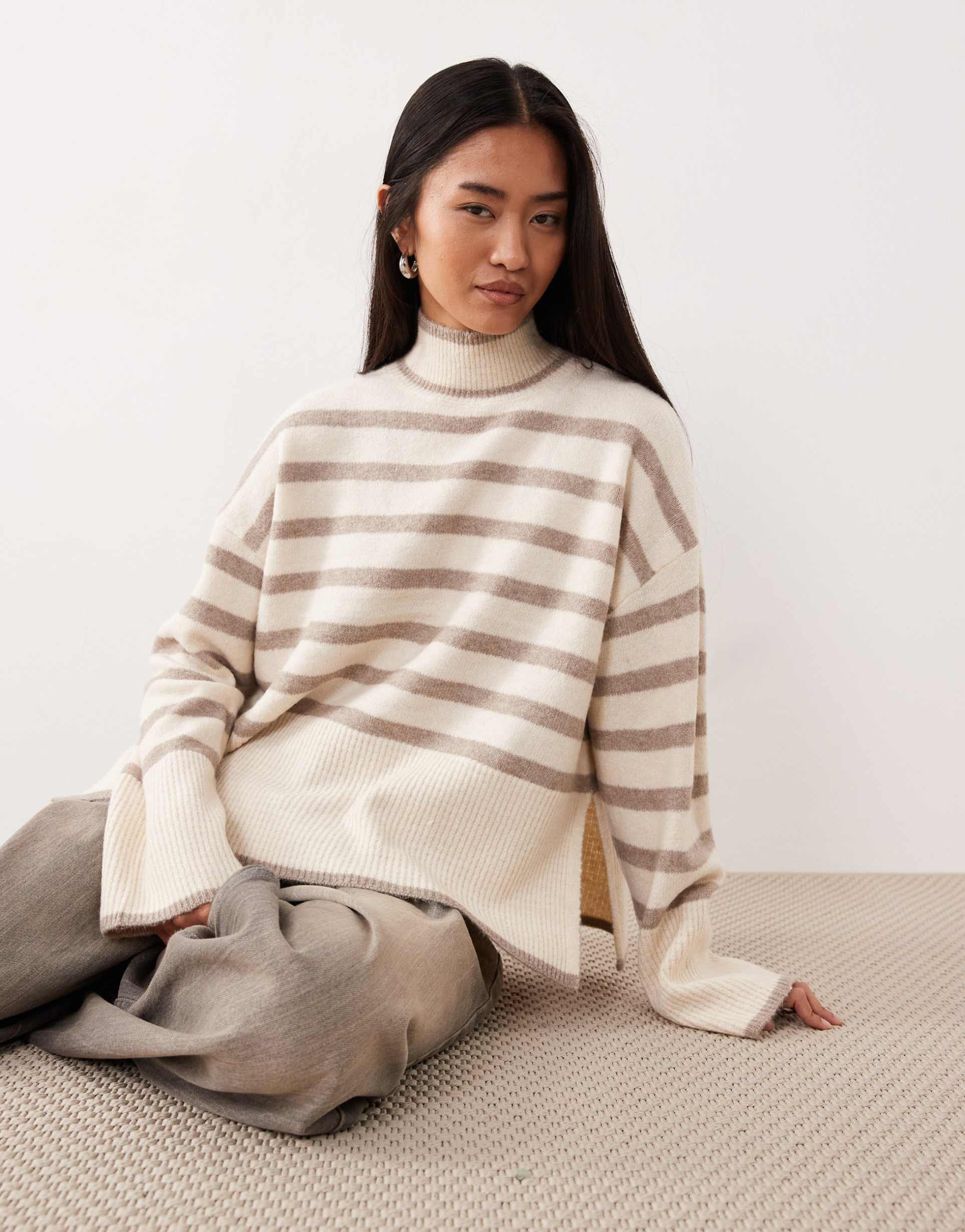 VILA HIGH NECK STRIPE SWEATER IN CREAM AND BEIGE