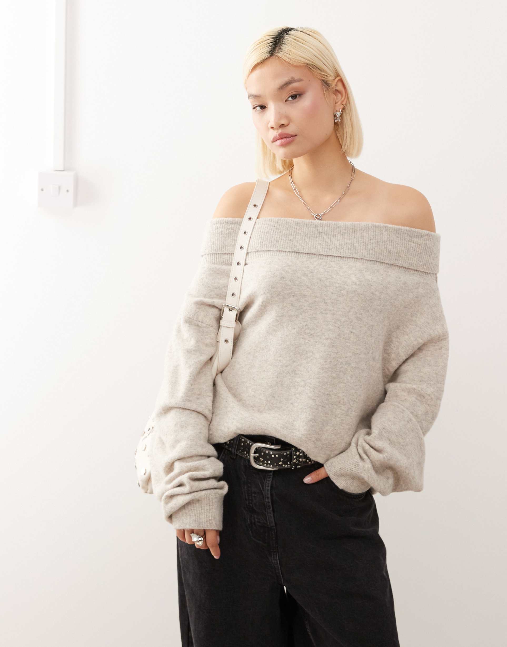 WEEKDAY SLOUCHY OFF THE SHOULDER SWEATER IN HEATHERED BEIGE - EXCLUSIVE TO ASOS