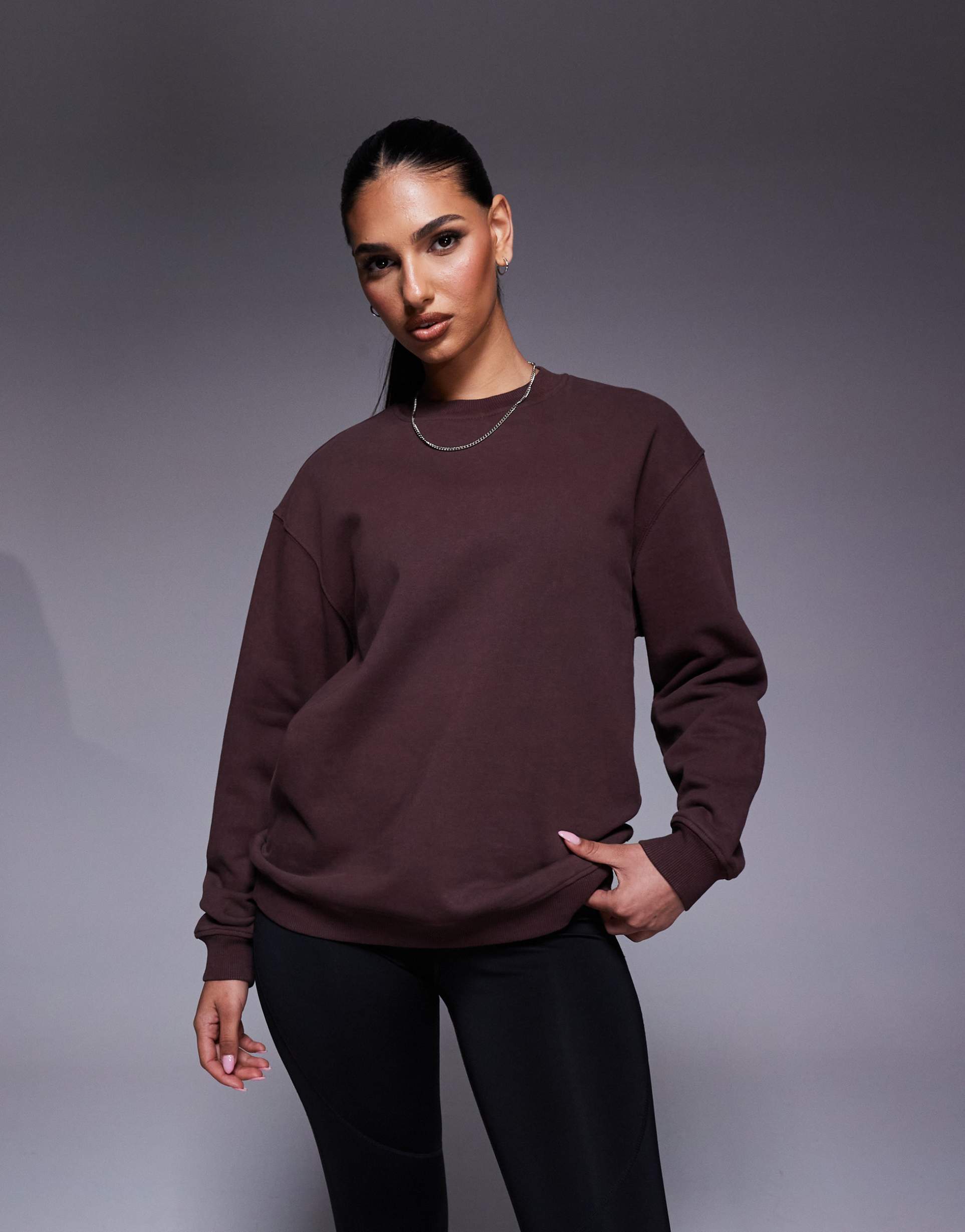 This oversized sweatshirt in a matte dark brown shade offers a cozy and relaxed fit, perfect for casual and workout settings. Crafted from soft, heavyweight cotton with a washed finish, it features a classic crew neck and drop shoulder sleeves that enhance its sporty chic vibe. Ribbed cuffs and hem add subtle design detail, while the pullover style ensures easy wear. Ideal for layering during autumn, winter, and spring, this sweatshirt combines comfort and style effortlessly for loungewear and active occasions.