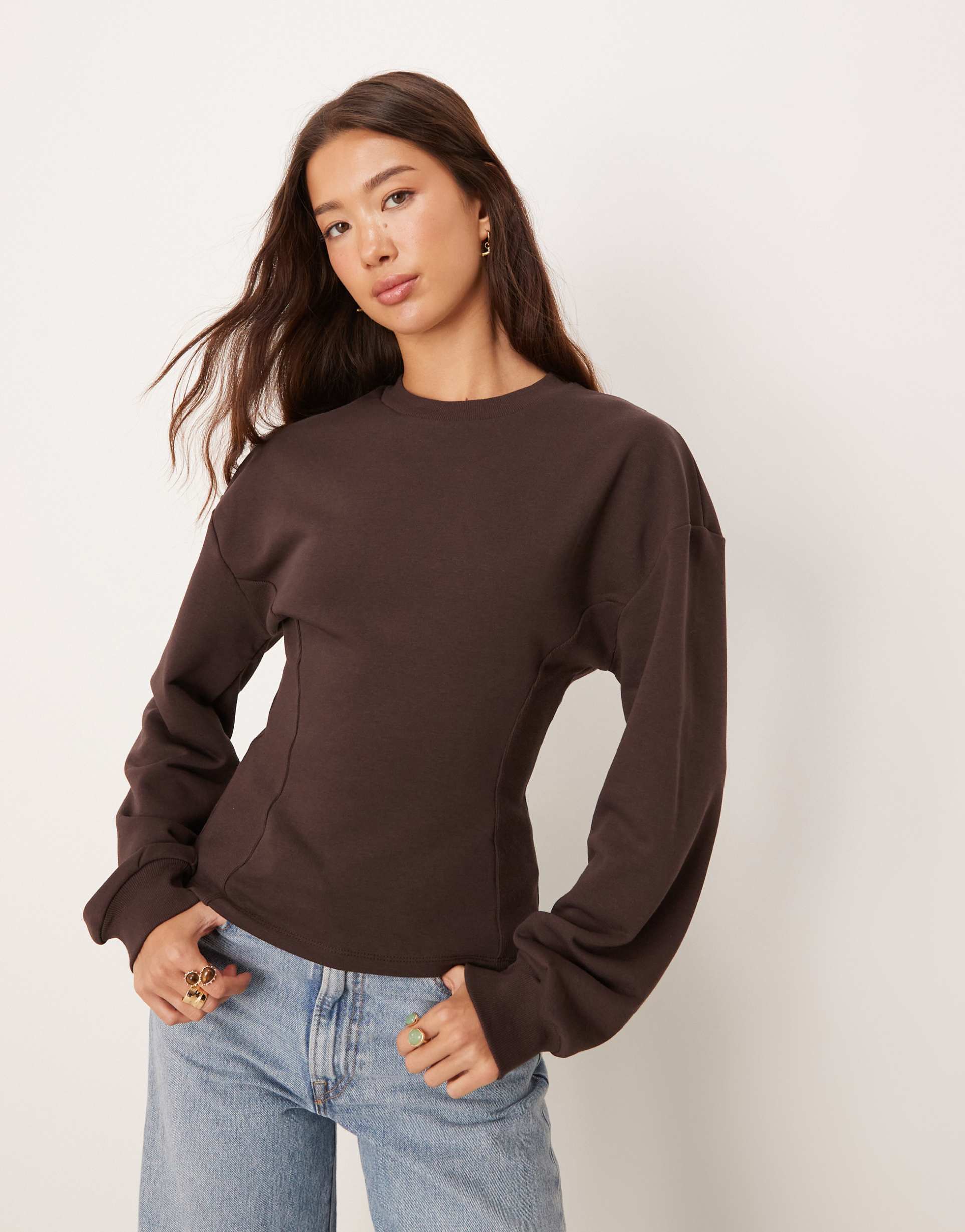 ASOS DESIGN CINCHED DETAIL RIBBED INSERT SWEATSHIRT IN CHOCOLATE