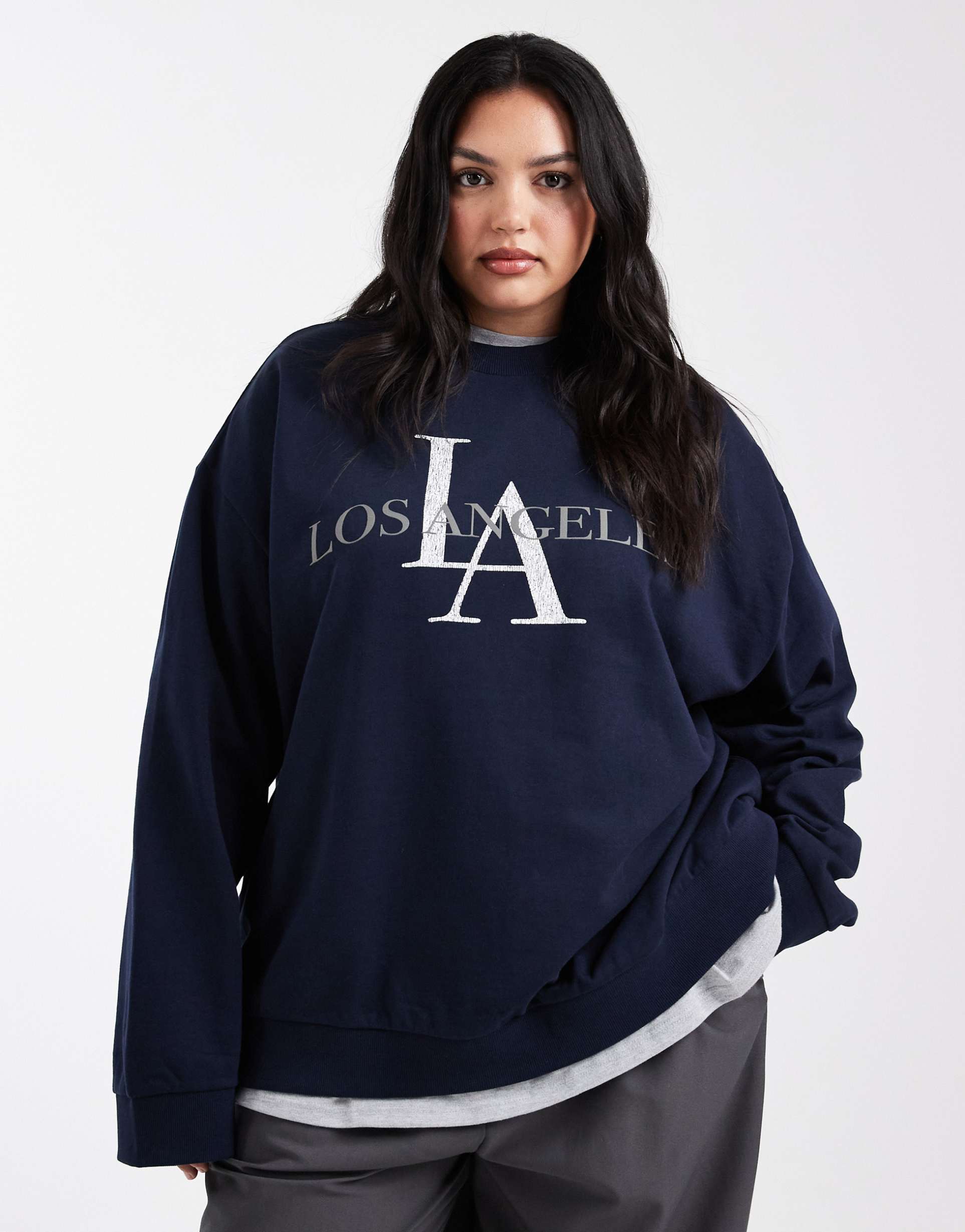 This ASOS DESIGN Curve oversized sweatshirt features a relaxed, hip-length silhouette in a deep navy cotton fabric with a cozy raised texture inside for warmth. Designed with a classic crew neck and distinctive drop-shoulder long sleeves, it offers an easy oversized fit ideal for casual, streetwear, or loungewear looks. The front showcases a bold white LA graphic print, adding a sporty street style edge. Ribbed trims complete the comfortable design, making it perfect for cooler seasons like autumn and winter, while the plus size cut ensures a flattering fit.