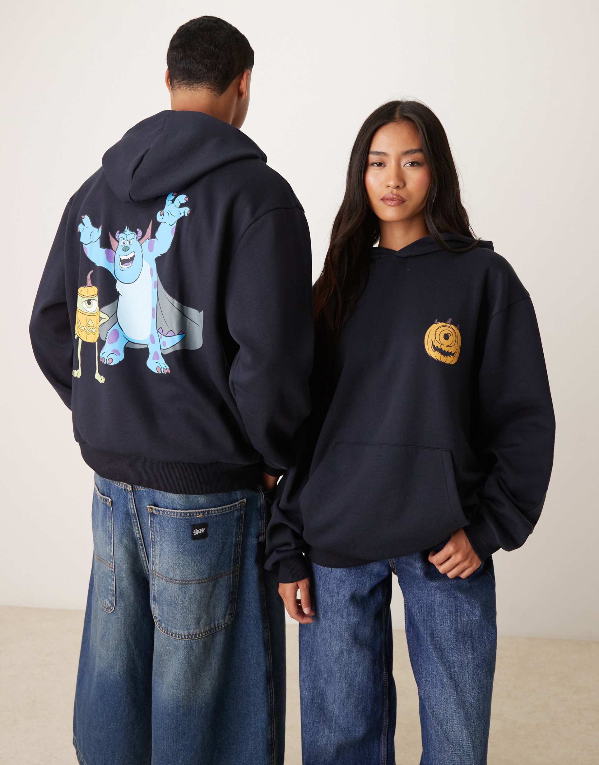 ASOS DESIGN DISNEY PIXAR HALLOWEEN RELAXED HOODIE WITH MONSTERS INC. PRINTS IN NAVY