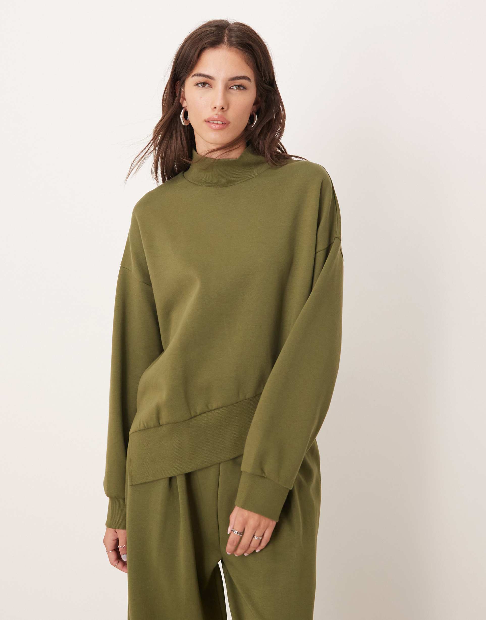 ASOS DESIGN INTERLOCK FUNNEL NECK SWEATSHIRT WITH ASYMMETRIC HEM IN KHAKI GREEN