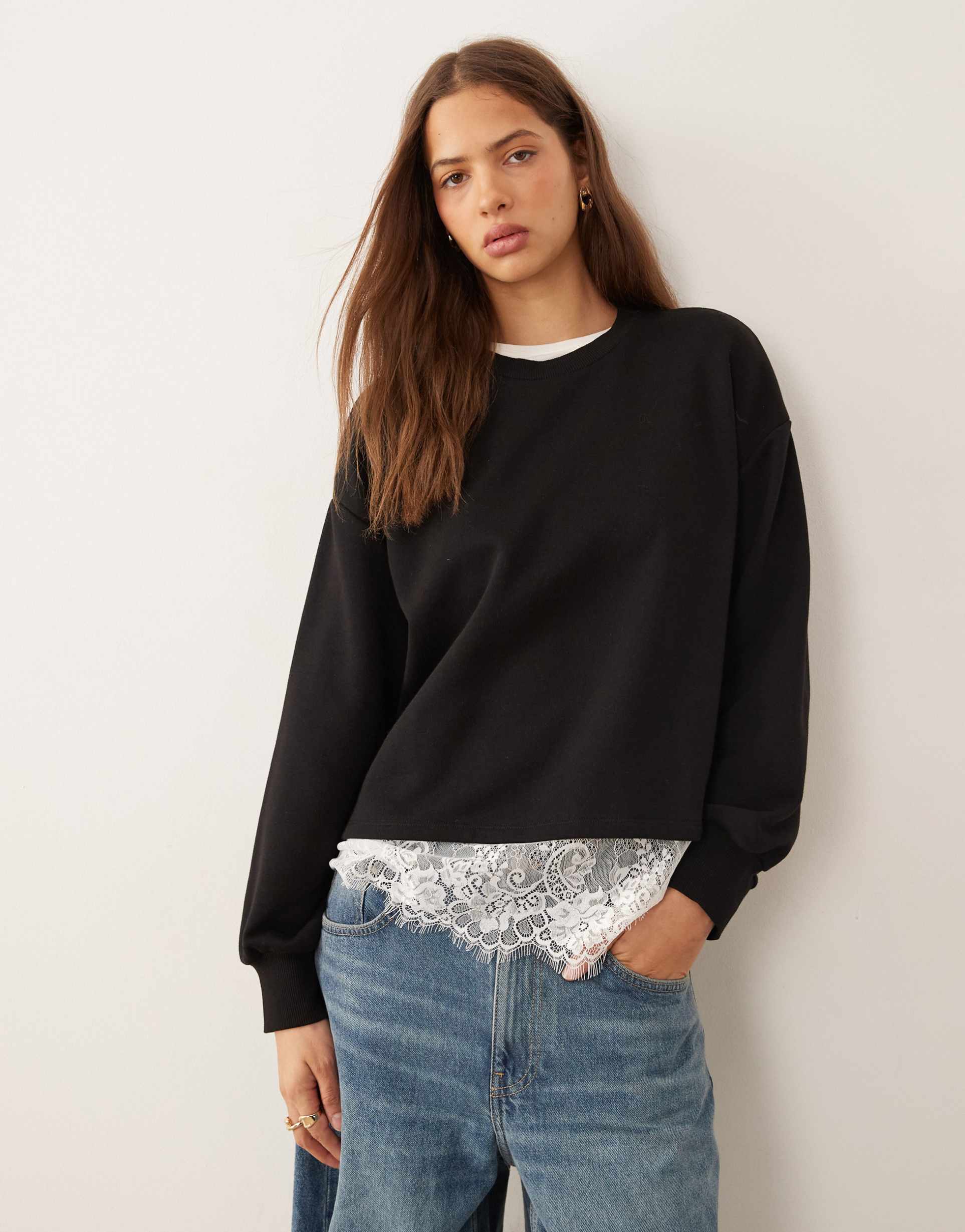 ASOS DESIGN OVERSIZED SWEATSHIRT WITH LACE HEM UNDERLAYER DETAIL IN BLACK