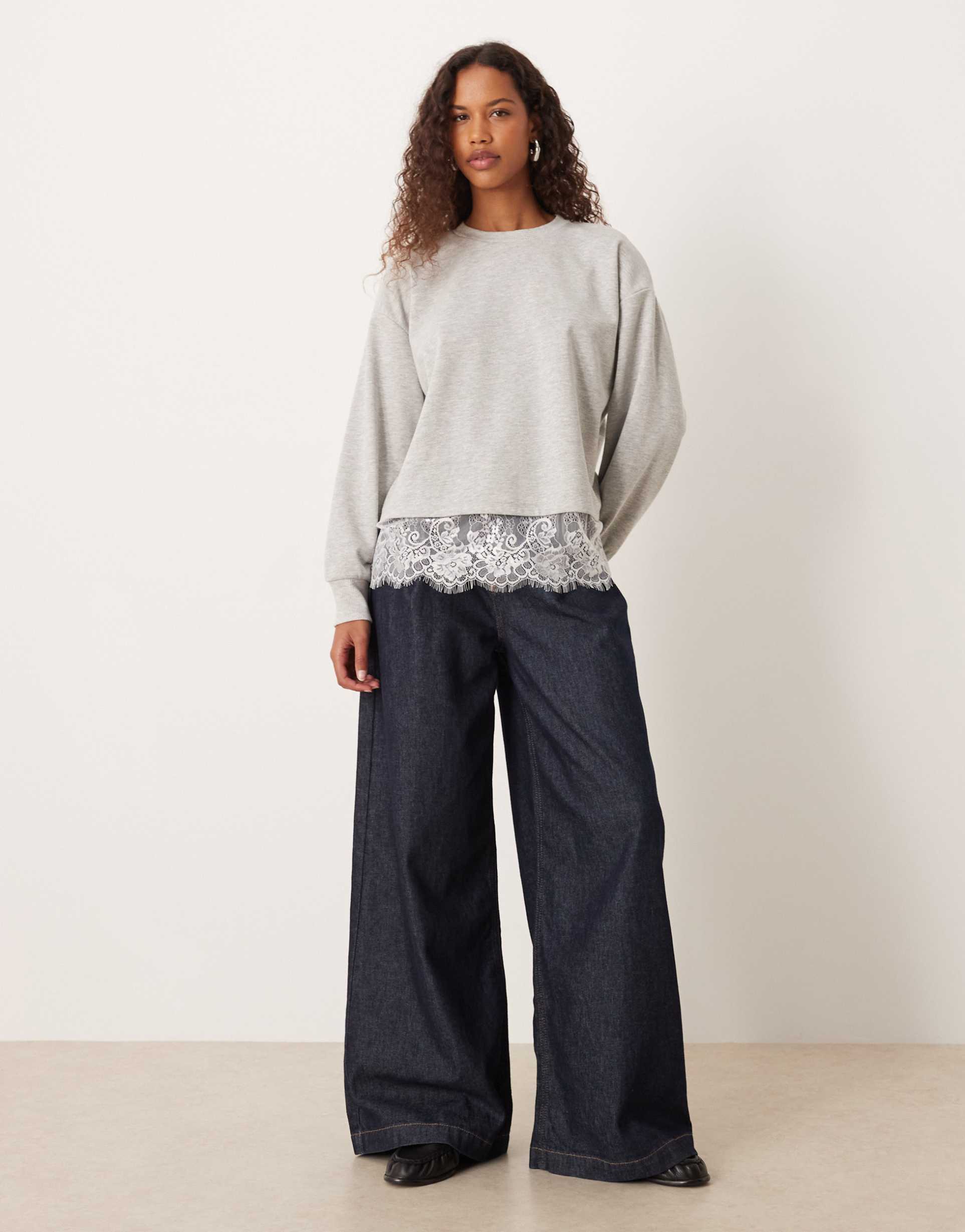 ASOS DESIGN OVERSIZED SWEATSHIRT WITH LACE HEM UNDERLAYER DETAIL IN GRAY
