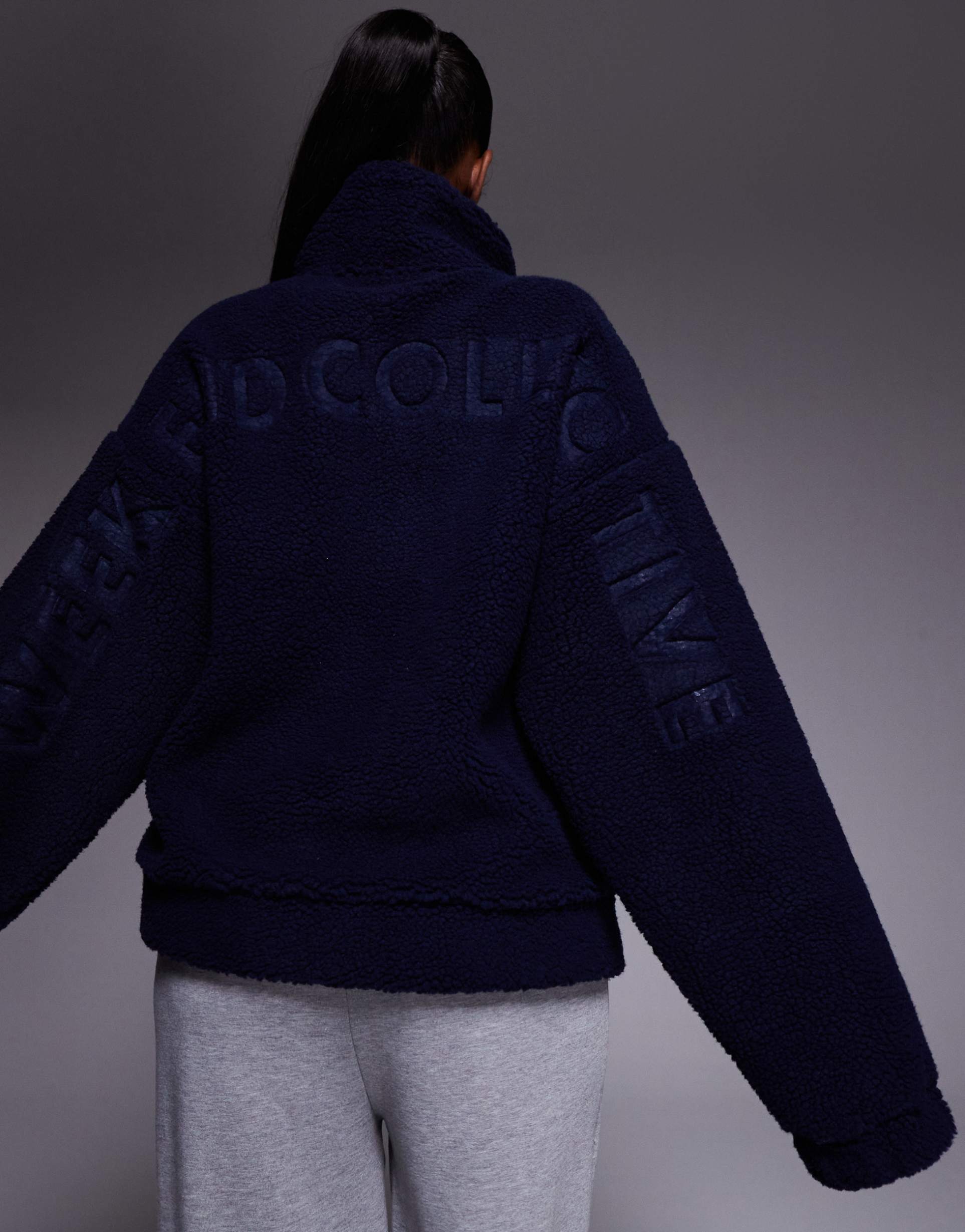 This navy blouson jacket features a high neck and a partial zip closure, crafted from soft polyester borg fabric with a teddy bear-like textured finish. The oversized fit and long regular sleeves offer cozy comfort, while the burnout graphic adds subtle detail. With its waist-length cut, this casual chic piece is perfect for loungewear, casual outings, or travel during autumn to spring seasons.