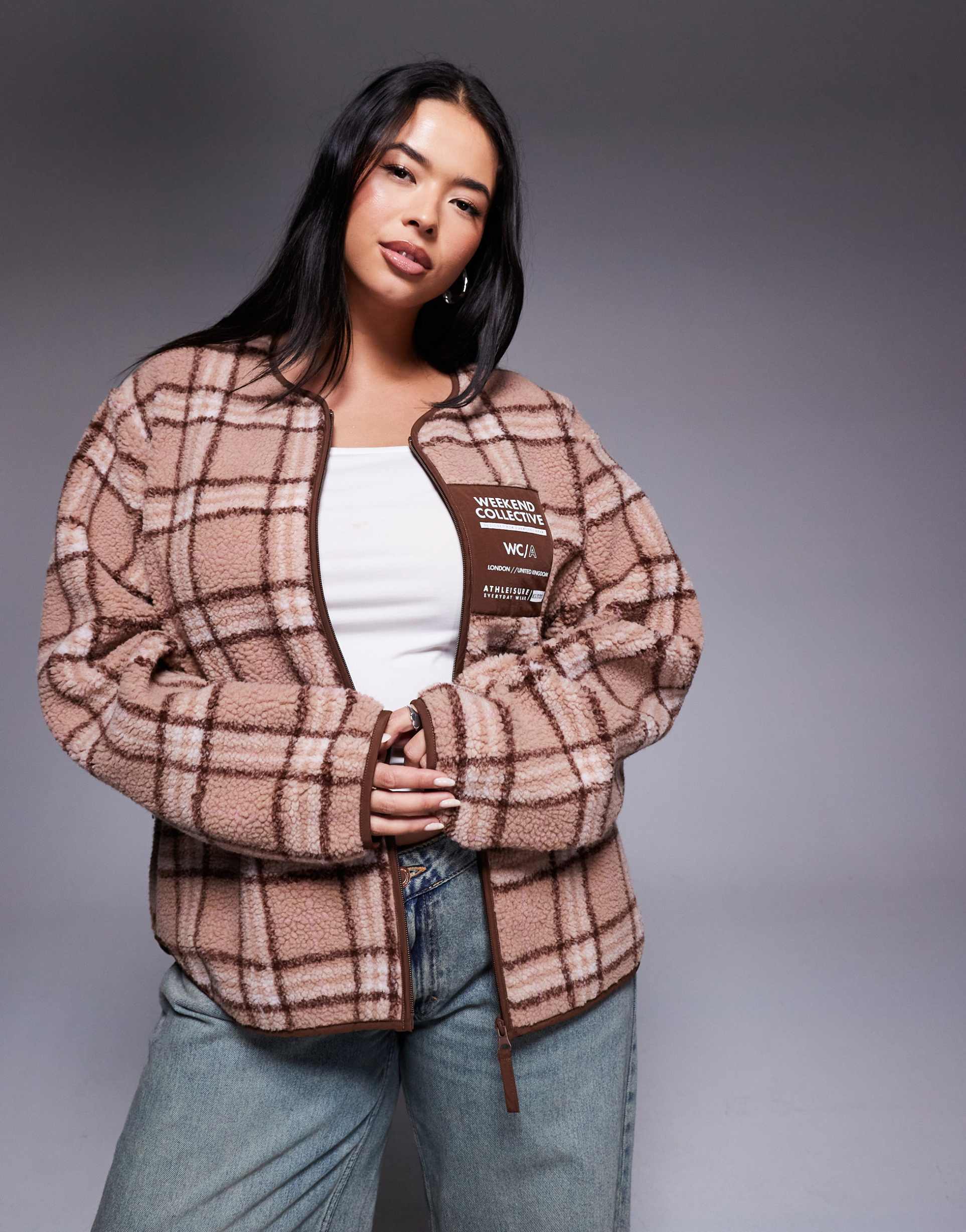 WEEKEND COLLECTIVE CURVE BORG ZIP UP FLEECE WITH PINK PLAID DESIGN