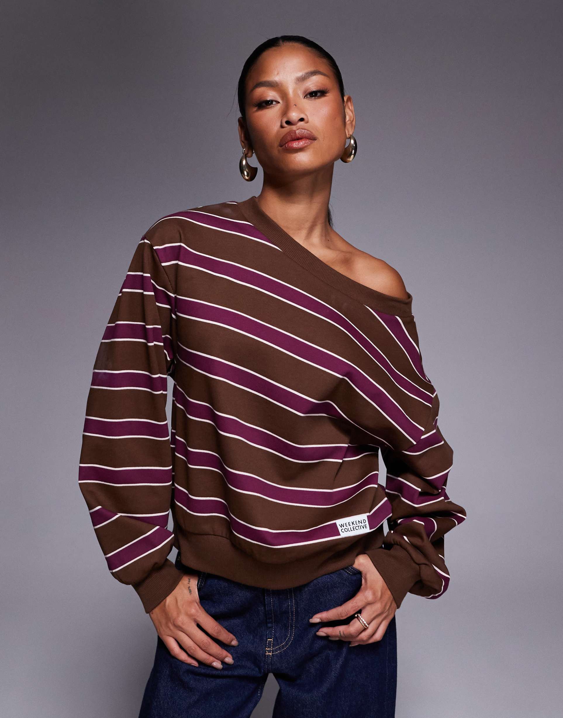 WEEKEND COLLECTIVE OFF THE SHOULDER SWEATSHIRT IN CHOCOLATE AND BURGUNDY STRIPES