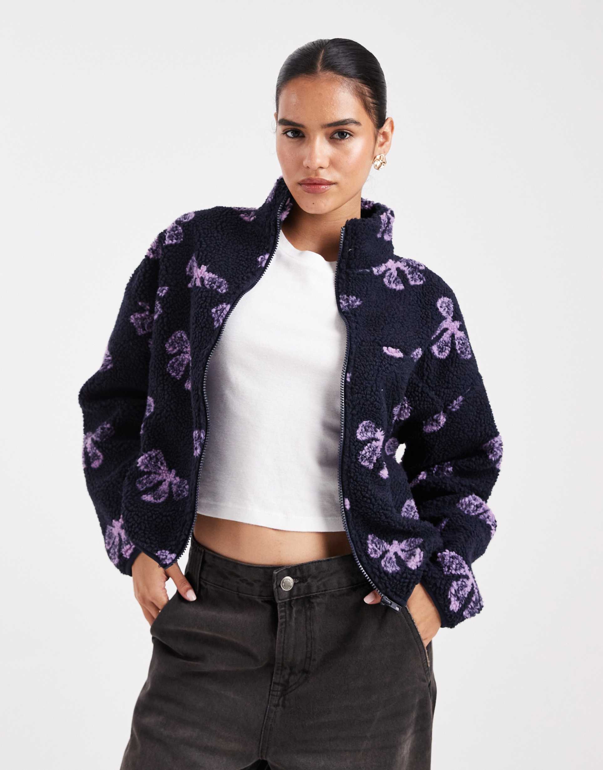 BRAVE SOUL BOW PRINT FULL ZIP FLEECE IN NAVY AND PURPLE