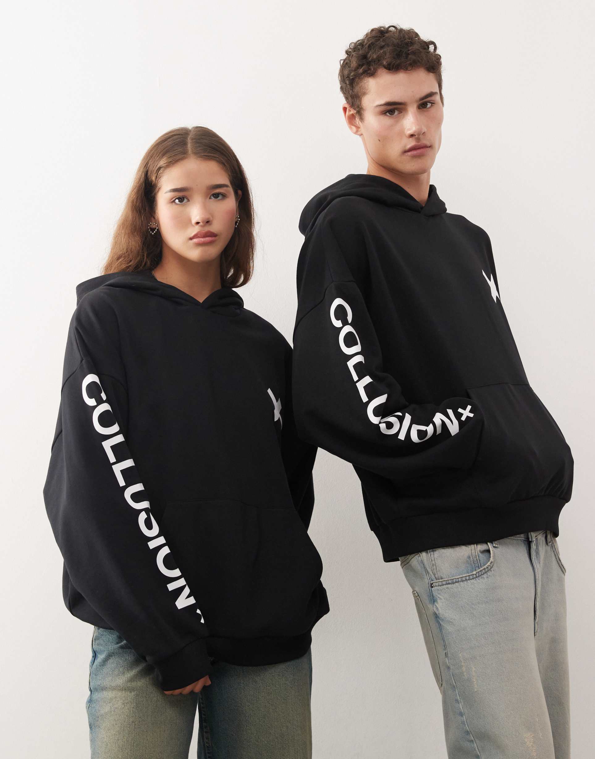 COLLUSION UNISEX LOGO BOXY HOODIE IN BLACK