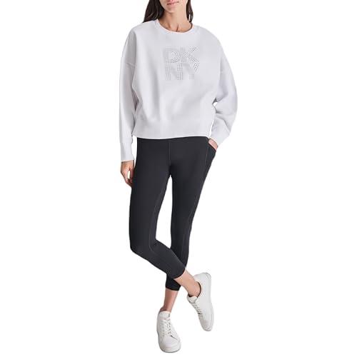 DKNY Women's Studded Logo Cropped Crewneck Fleece Sweatshirt, White, Large