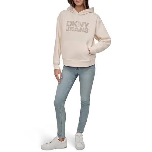 Embrace effortless style with this cozy cream hooded pullover featuring DKNY Jeans branding on the front. Crafted from a soft fleece blend, this piece offers exceptional comfort for casual outings or relaxing at home. The long sleeves and hip-length cut ensure a flattering fit, making it a versatile addition to your wardrobe for spring and autumn days. Pair it with your favorite jeans for a stylish streetwear look or lounge around in total comfort. Elevate your effortless chic with this must-have staple!