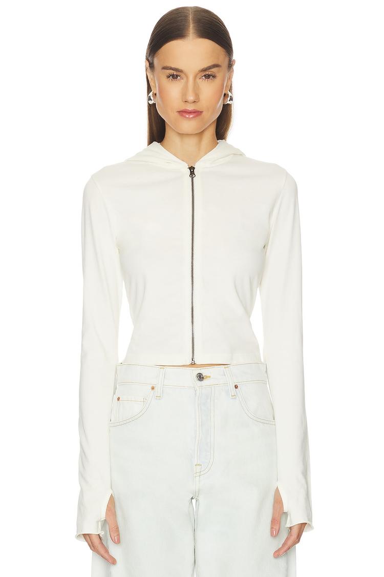 This cropped, fitted zip hoodie in off-white cotton offers a minimalist and casual chic look perfect for everyday wear. Featuring a front zipper closure and a hood, it provides a sleek silhouette with long regular sleeves and a snug fit. Ideal for spring and autumn, this versatile hoodie pairs effortlessly with casual and street style outfits, making it suitable for relaxed occasions, loungewear, or casual outings. The clean, solid design emphasizes comfort and style in a simple, modern package.