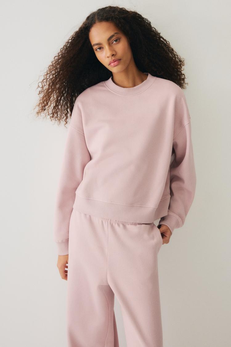 This two-piece sweatshirt and joggers set in a soft dusty pink hue offers a comfortable, loose fit ideal for casual wear. The sweatshirt features a classic crew neck and long regular sleeves, crafted from cozy cotton fabric with a subtle textured finish. The waist-length top pairs effortlessly with matching elastic-waist joggers, perfect for lounging, travel, or casual outings. With its pullover closure and minimalist solid design, this set embodies casual chic style for year-round comfort.
