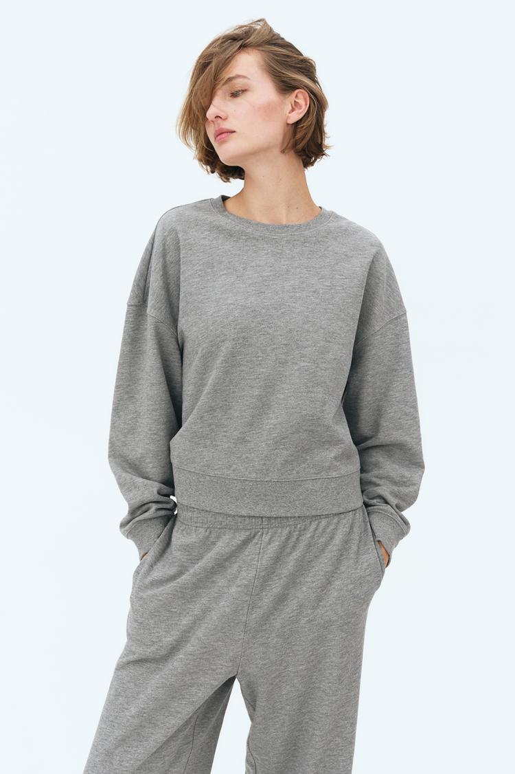 This relaxed-fit sweatshirt features a classic crew neck and long regular sleeves, crafted in a soft, textured cotton-polyester blend fabric. Its waist-length silhouette and subtle heather gray tone make it an ideal choice for casual wear, loungewear, or travel comfort. The pullover design includes practical side pockets, adding functionality to its minimalist style. Perfect for layering or wearing solo, this sweatshirt offers versatile, all-weather comfort with a clean, understated aesthetic.
