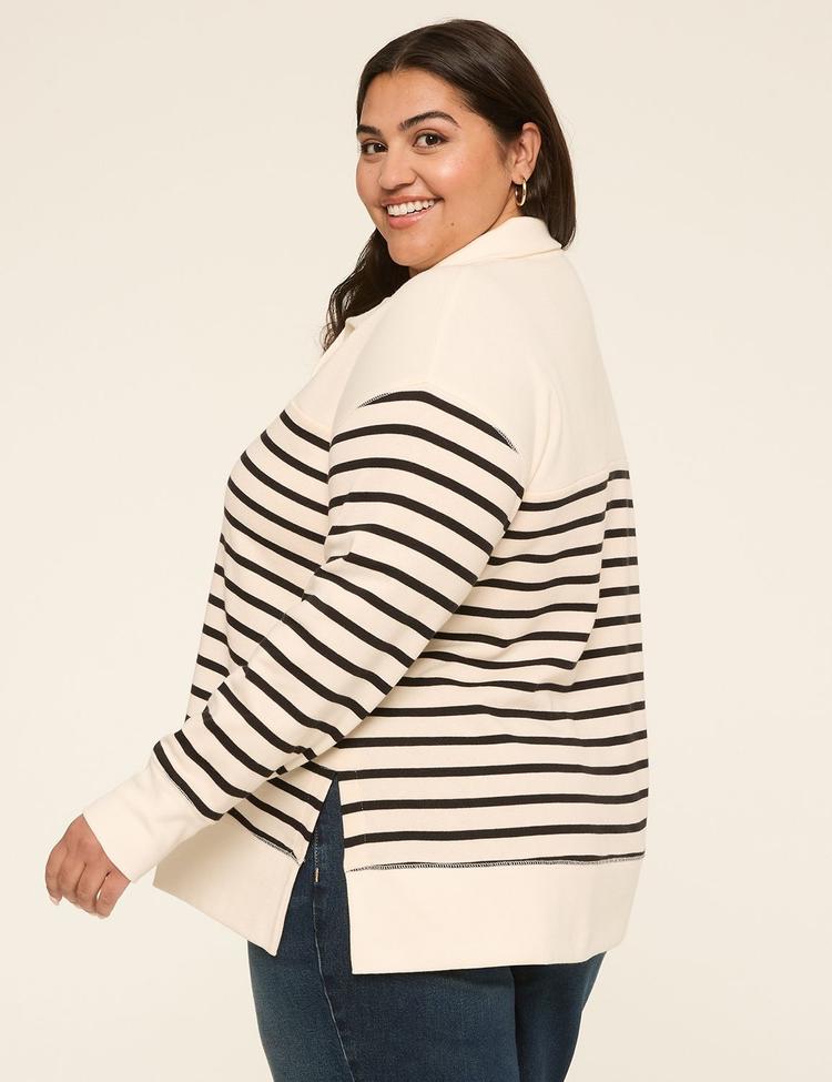 This plus-size long-sleeve sweatshirt features a classic pullover fit with a notched lapel collar and regular sleeves. Crafted from a cozy French terry fabric blend of cotton, polyester, and elastane, it offers comfortable warmth and stretch. The off-white base is accented by black horizontal stripes all over, complemented by ribbed trim on cuffs and hem. Side slits at the hip-length high-low hem add ease of movement and a casual chic vibe. Ideal for casual outings, loungewear, or travel during cooler seasons, this sweatshirt balances comfort and style effortlessly.